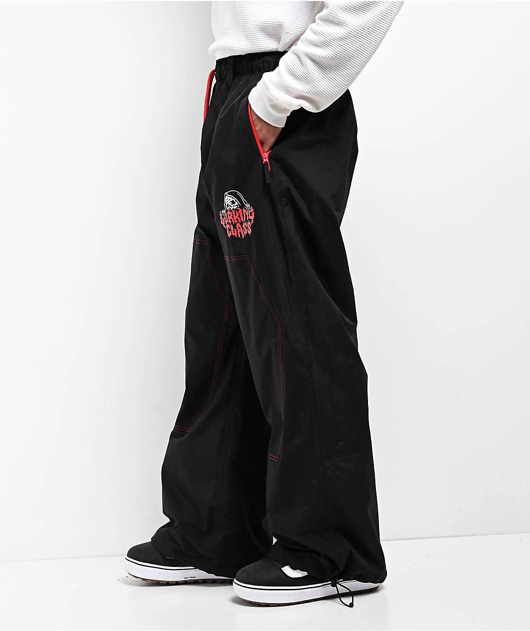 Lurking Class by Sketchy Tank introduces the Thorn 10K snowboard pants in a black and "Poinsettia" red colorway, delivering an edgy vibe. This coat is furnished with a screen-printed graphic on the left leg displaying a grim reaper holding metal-insp