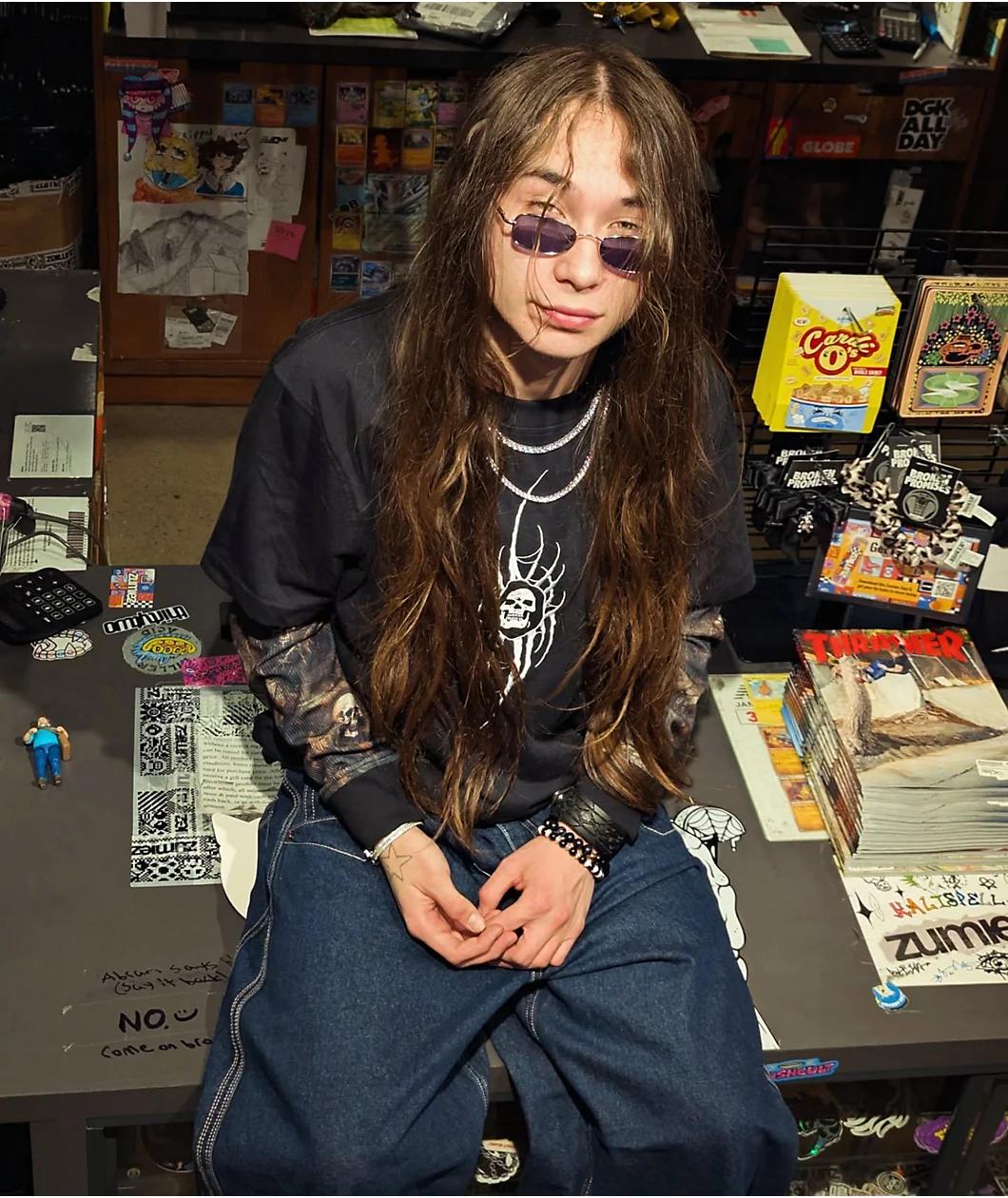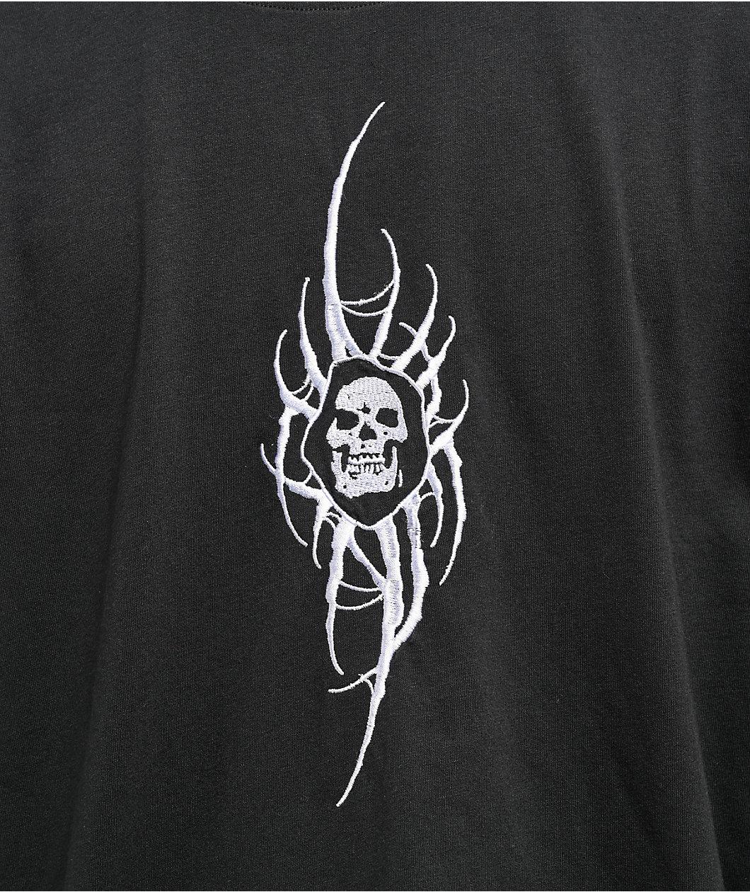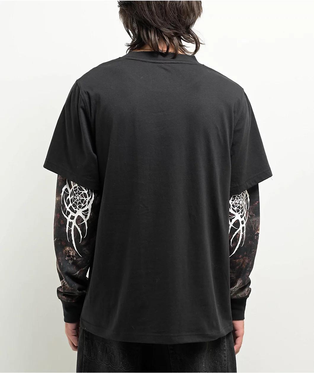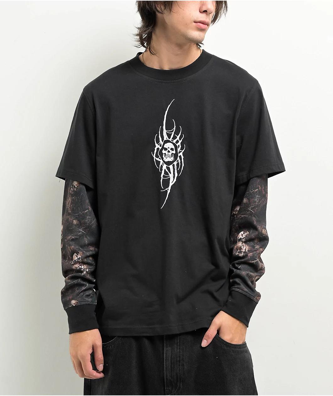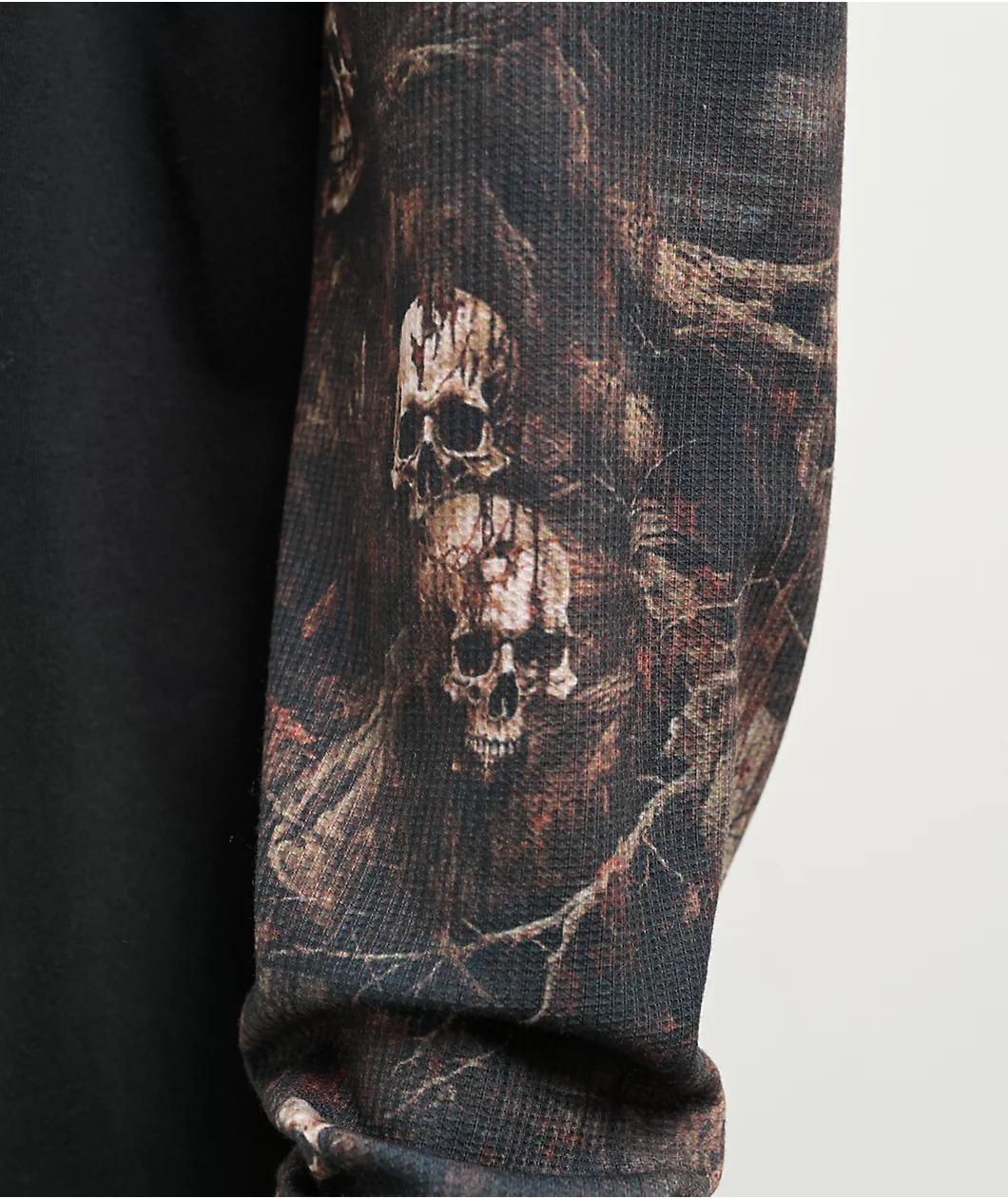 Stay warm in sinister style with the Sin black and camo 2fer long sleeve t-shirt from Lurking Class by Sketchy Tank. The thermal waffle knit sleeves feature a camouflage pattern with skulls throughout for a eerie twist on classic camo. Screen-printe