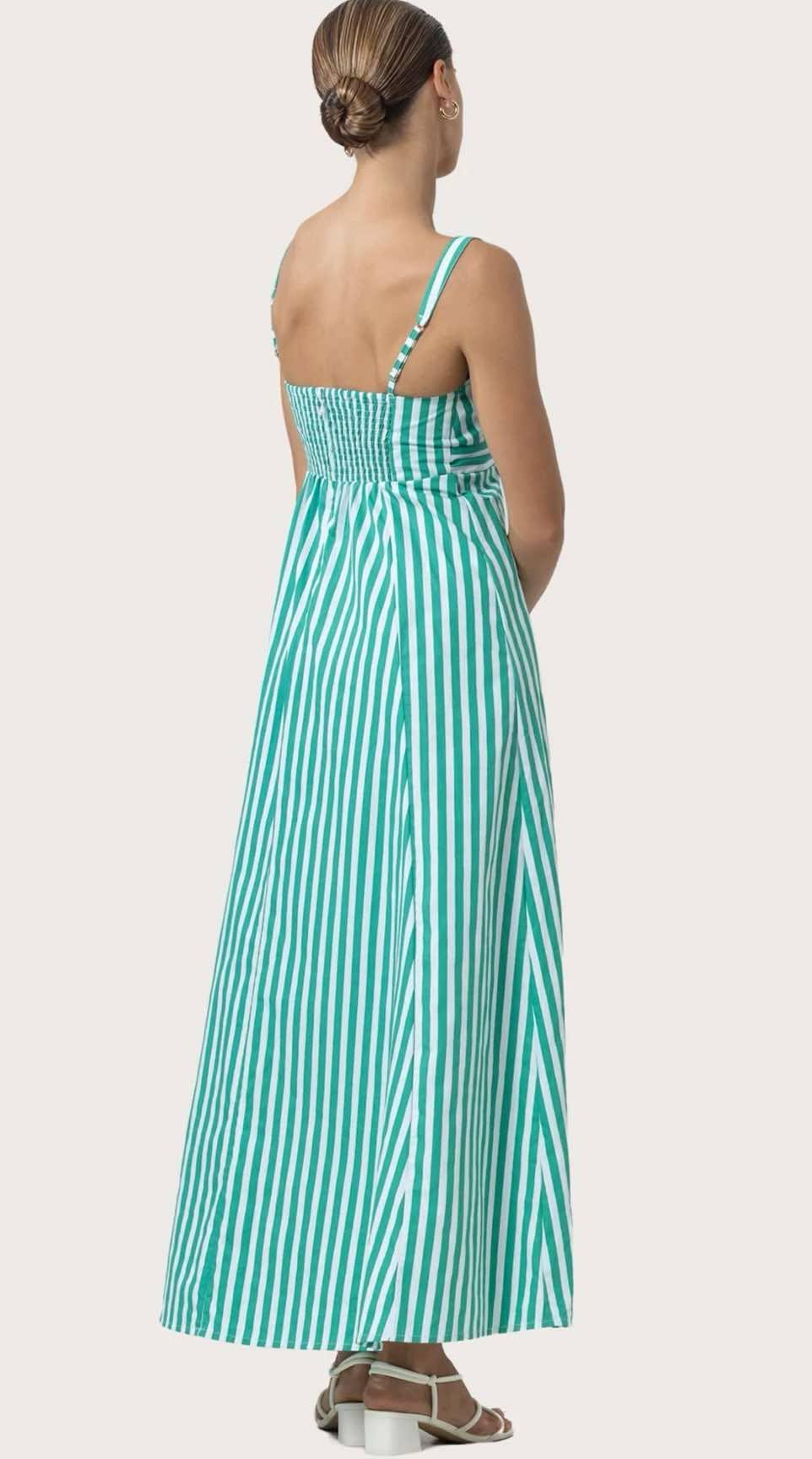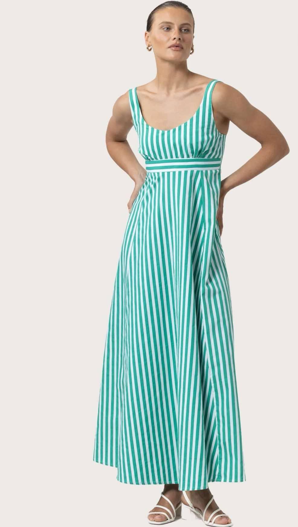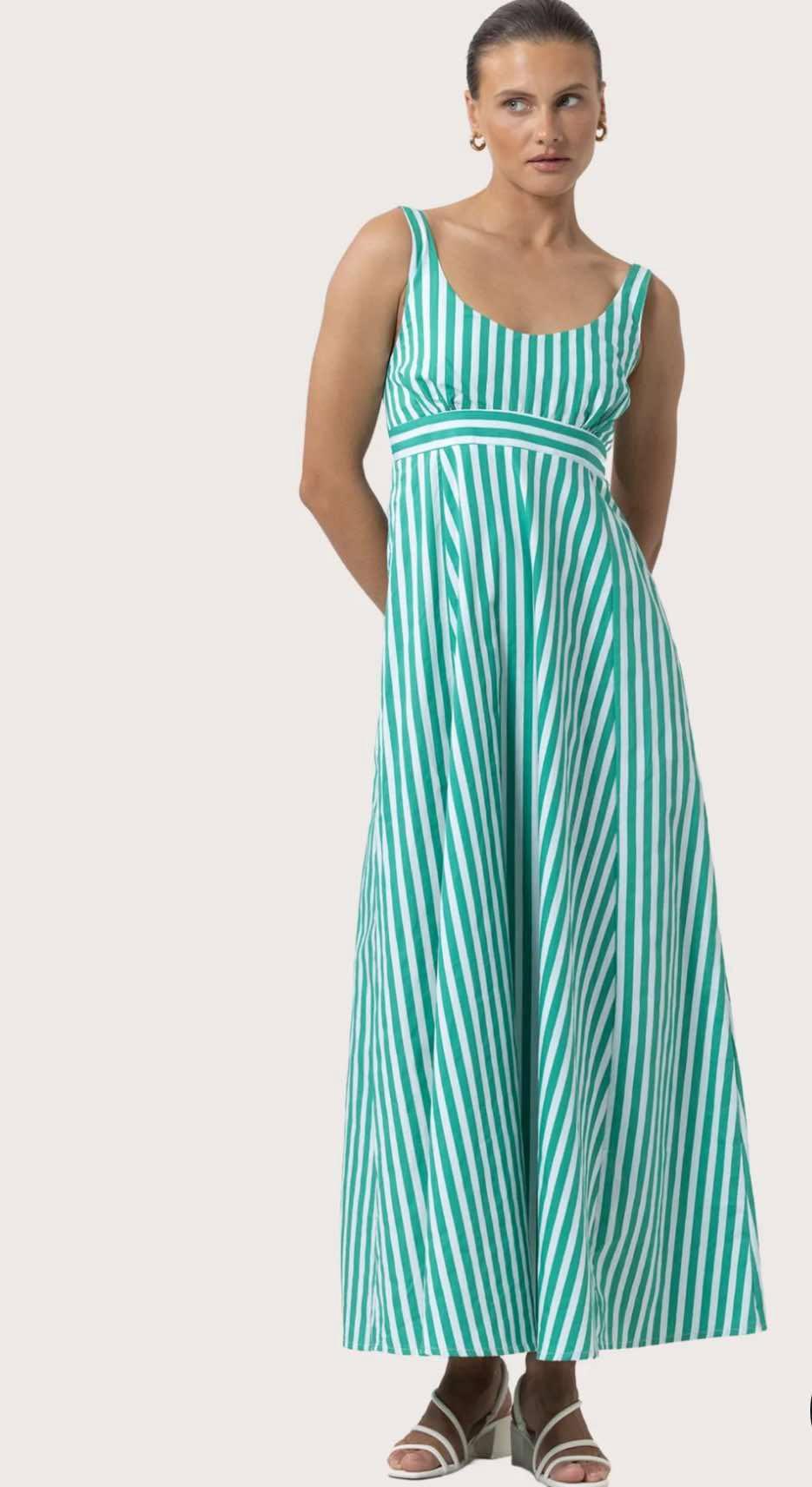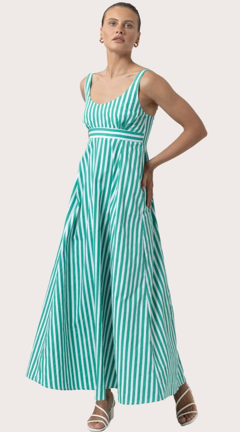 This elegant dress features adjustable wide straps and a fitted empire bodice for a flattering, structured fit. The contrast band adds a refined design detail, while subtle shirring ensures comfort through the bodice. A back zipper closure offers a seamless finish, and the A-line panelled skirt creates soft movement with every step. Fully lined for comfort, this silhouette blends classic charm with modern craftsmanship—ideal for both daytime occasions and evening dressing.