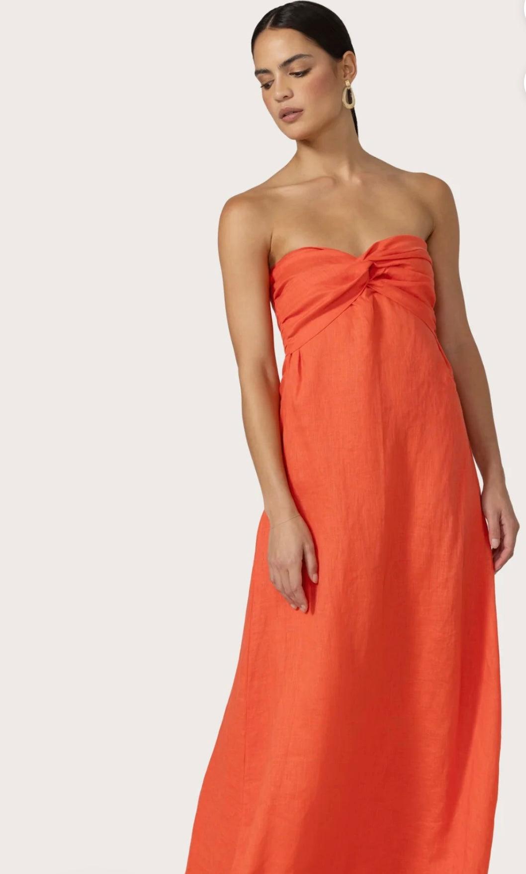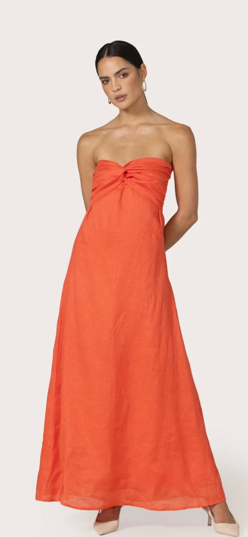 Introducing the Melody Linen Maxi Dress, an exquisite addition to your wardrobe. Crafted from 100% European Flax Linen in the captivating gorgeous salsa color, this dress is the epitome of elevated event dressing. The strapless, full-length design boasts a twisted contrasting color bra detail, exuding both style and grace.
