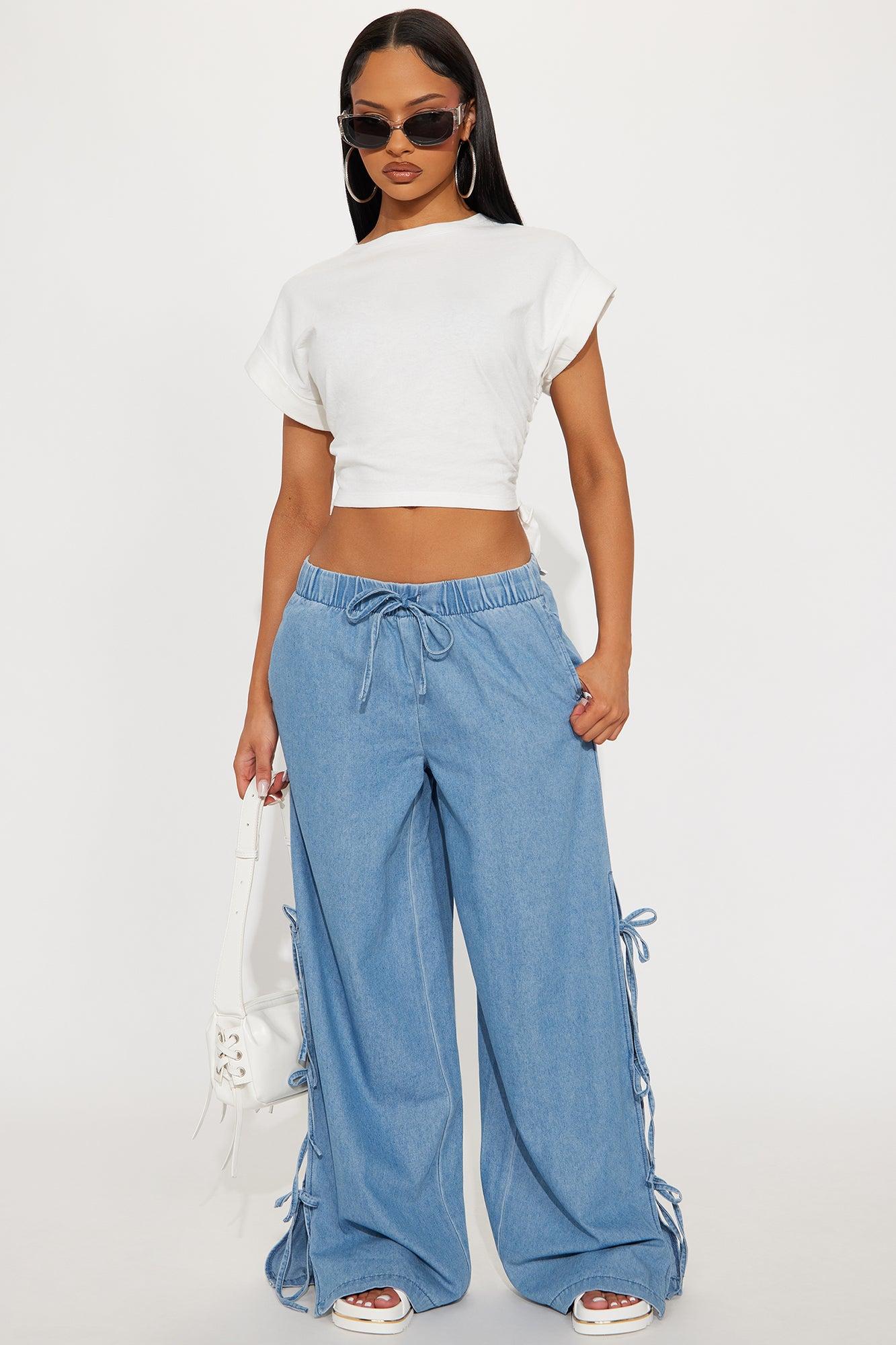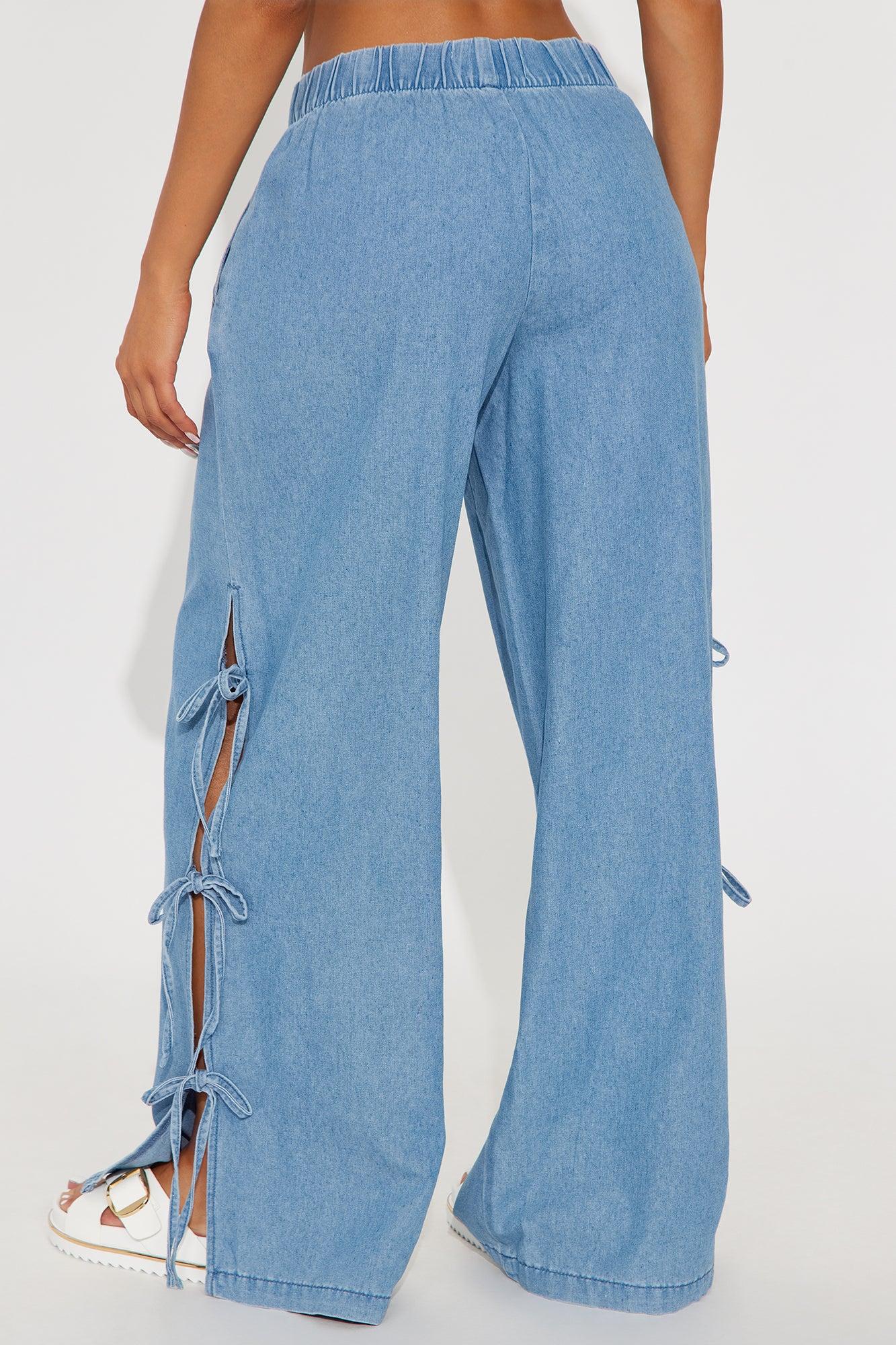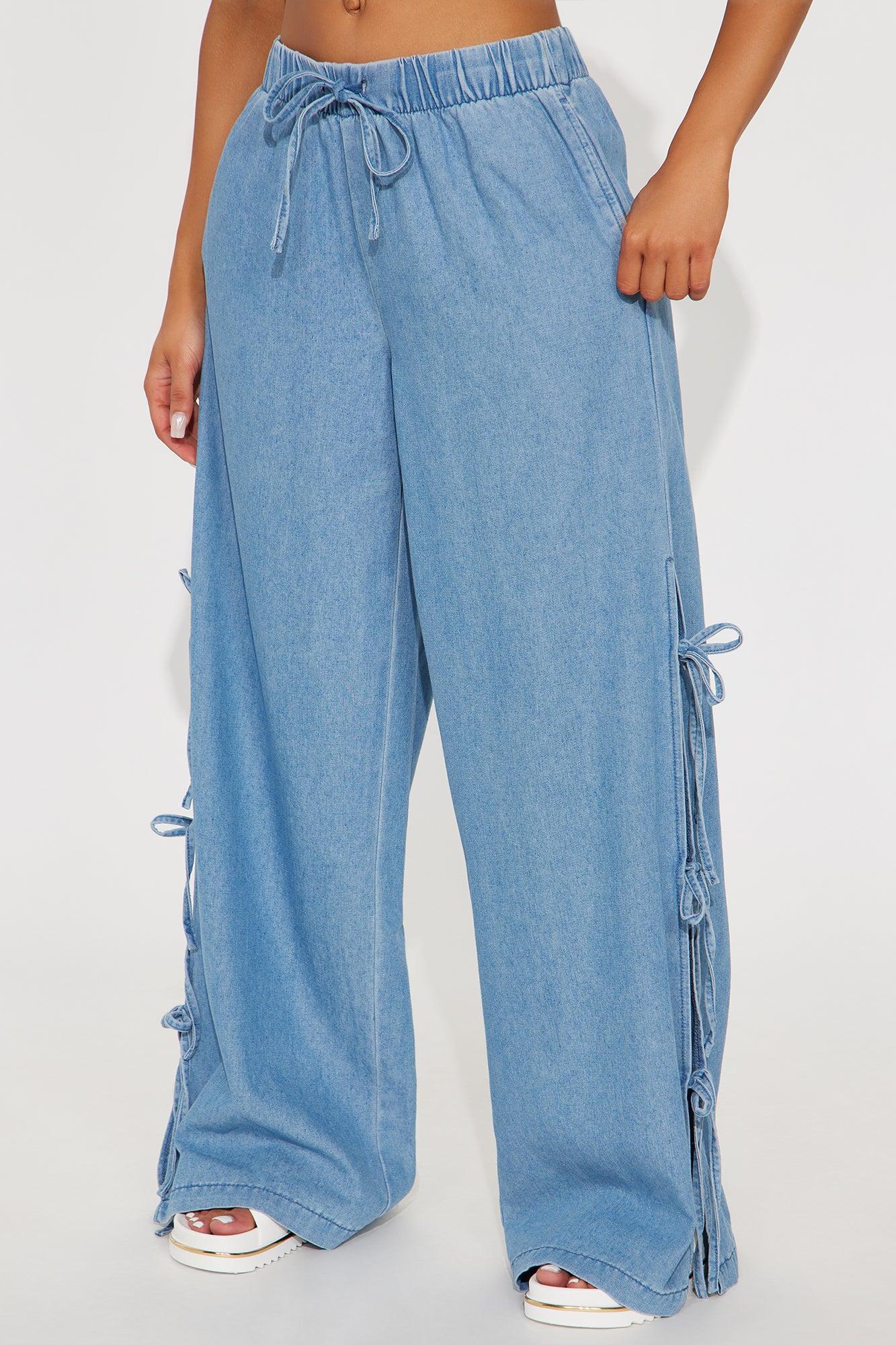 Available In Medium Wash. Chambray Wide Leg Pant Drawstring Waist Elastic Waistband Side Tie Details 10" Mid Rise 32" Inseam 57% Cotton 26% Rayon 17% Polyester Non Stretch Imported