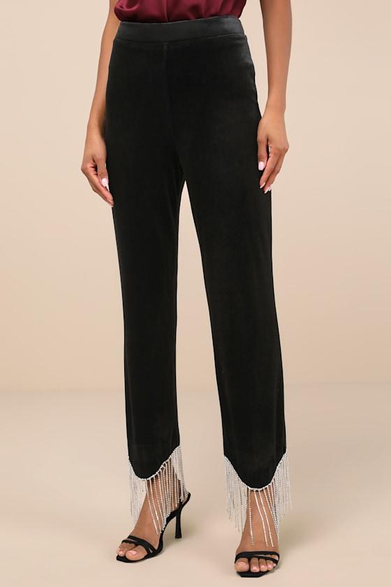 From evenings of dancing to glamorous holiday parties, the Lulus Lustrous Aura Black Velvet Rhinestone Fringe Cropped Pants will make sure you look effortlessly fabulous! These dazzling pants have a luxe velvet construction that shapes a high, banded waist and slim-fitting pant legs that fall to cropped hems embellished with eye-catching rhinestone fringe. Hidden back zipper/clasp.