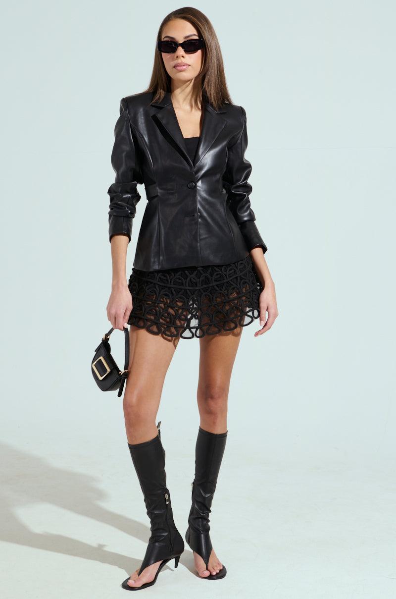 Be so faux real, you need The AKIRA Label Luxe Faux Leather Cut-Out Blazer in your life. Crafted from supple, subtly pebbled faux leather, this haute jacket features a slim-fitting, tapered silhouette, a notch-lapel collar, long sleeves with lightly padded shoulders, flattering contour seaming, and sexy side seam and upper back cut-outs for added edge. Complete with smooth interior lining and a two-button front closure. Style with a vintage band tee, distressed, baggy denim, and leather boots for an effortlessly cool ensemble. - 50% PU, 50% Polyester- Hand Wash or Dry Clean Only- Slight Stretch- Imported (all measurements approximate from size small)- 24.5” Shoulder to Hem- 15.5” Shoulder to Shoulder- 25.5” Sleeves- Model is 5’10” and wearing a size smallProduct ID: 1025900 (all measurements approximate from size 1X)- 26.5” Shoulder to Hem- 17.5” Shoulder to Shoulder- 27” SleevesProduct ID: 1025904
