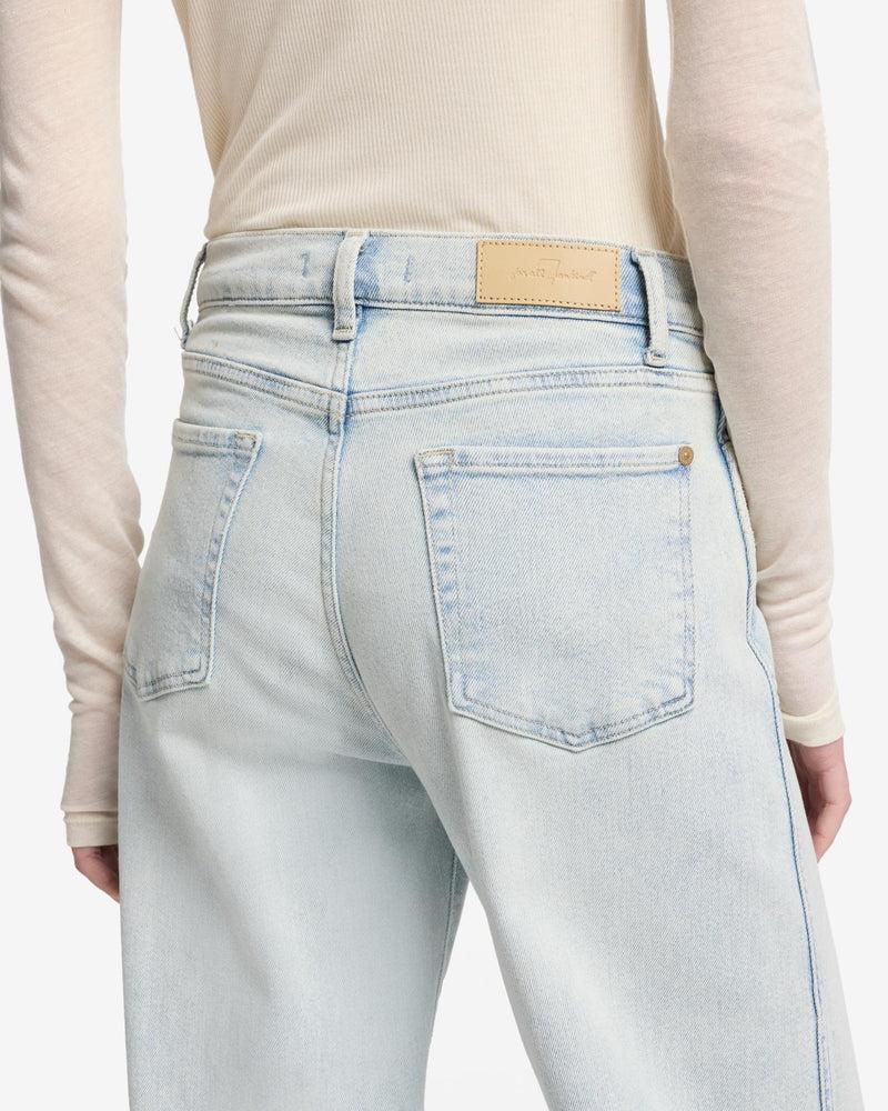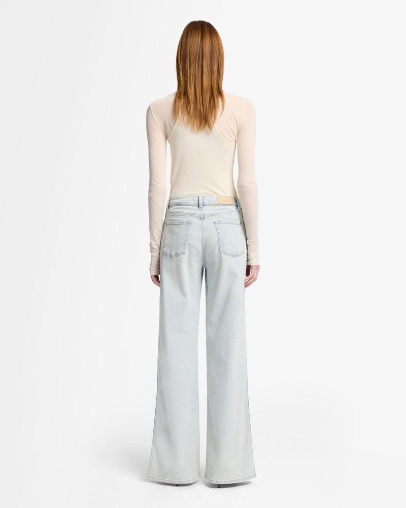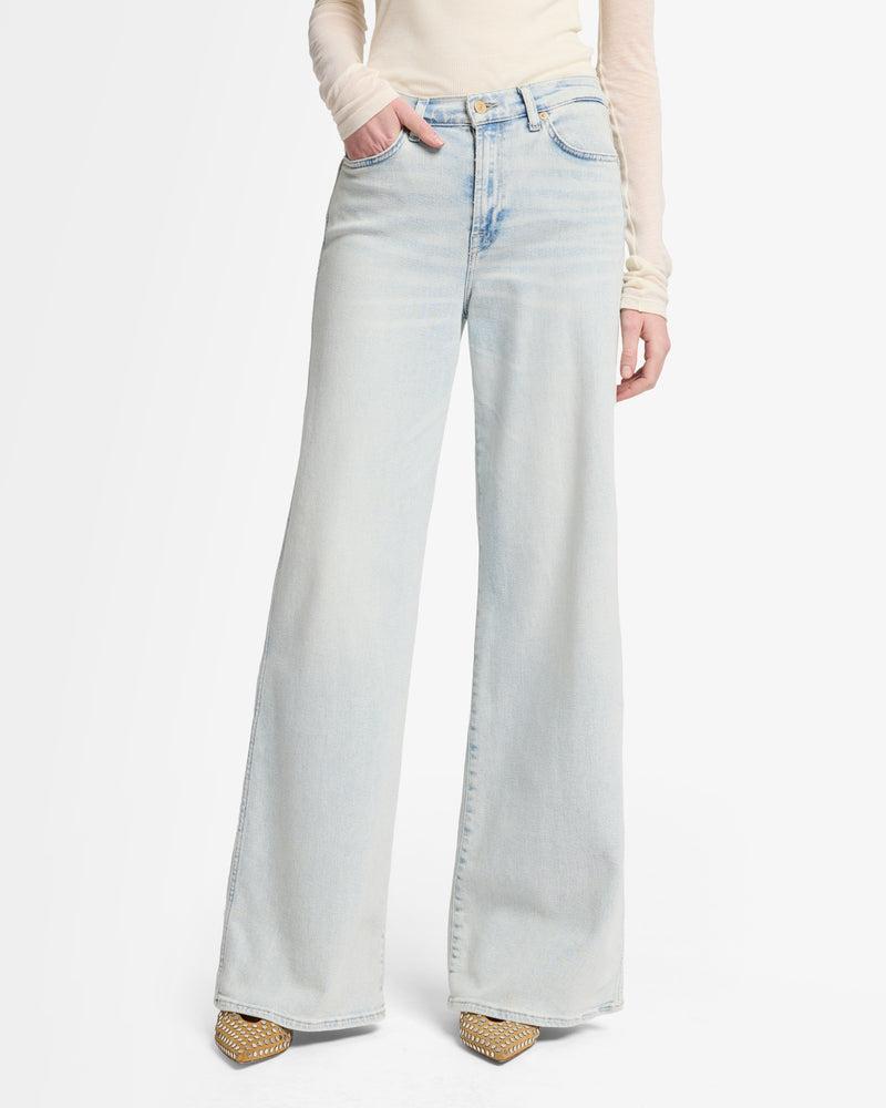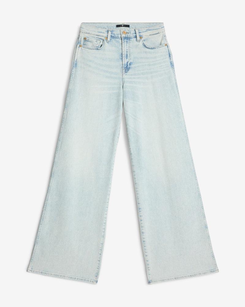 Fits like: A high-rise wide-leg fit that defines the waist and flows effortlessly into a full-length silhouette for a flattering, statement-making look. Feels like: Luxe Vintage softness designed with medium stretch for a vintage-inspired look and modern comfort. The Details: Light wash Heavy sanding down the thighs fo
