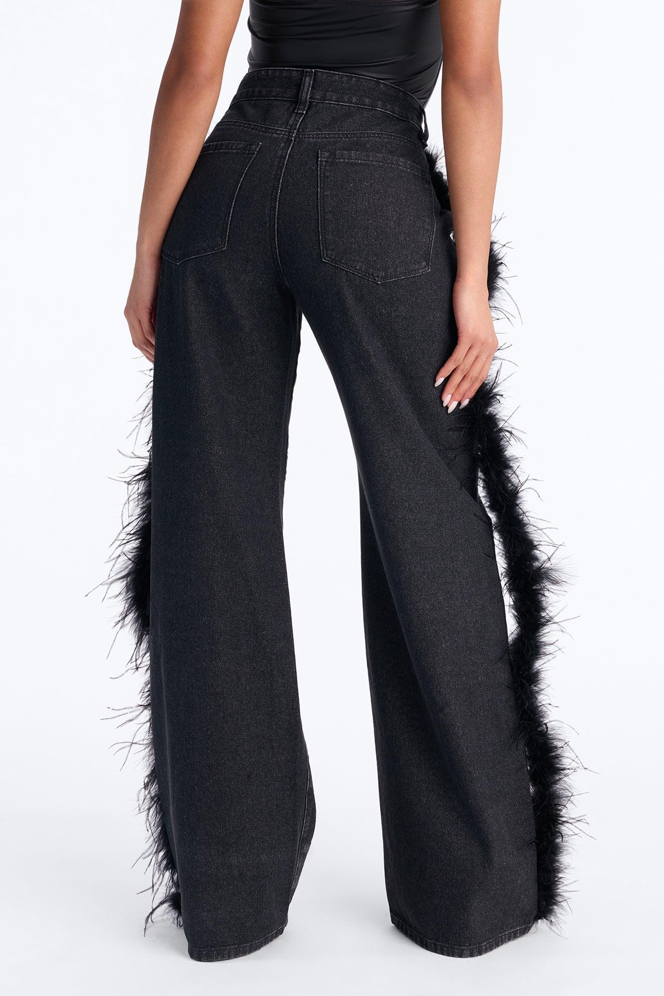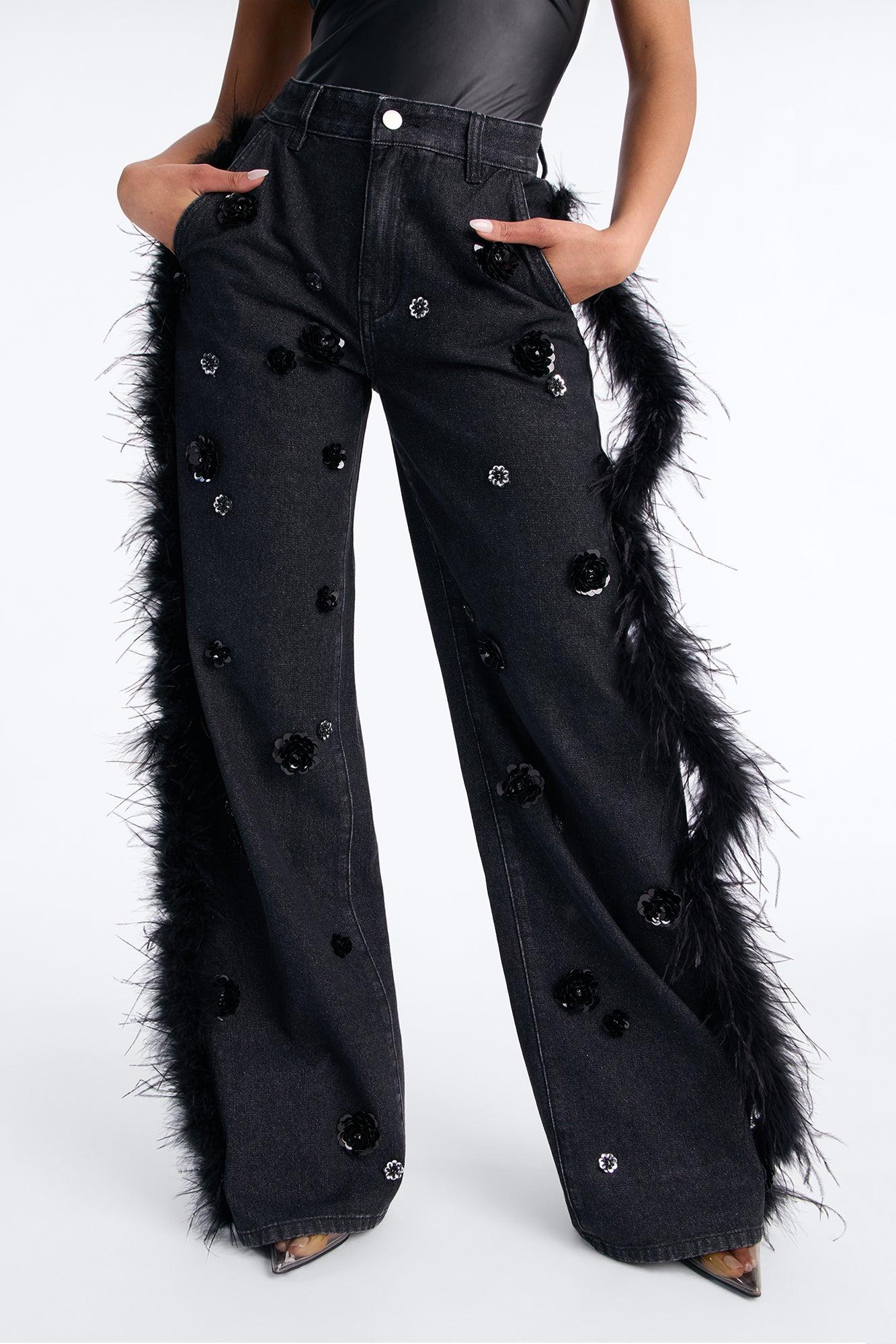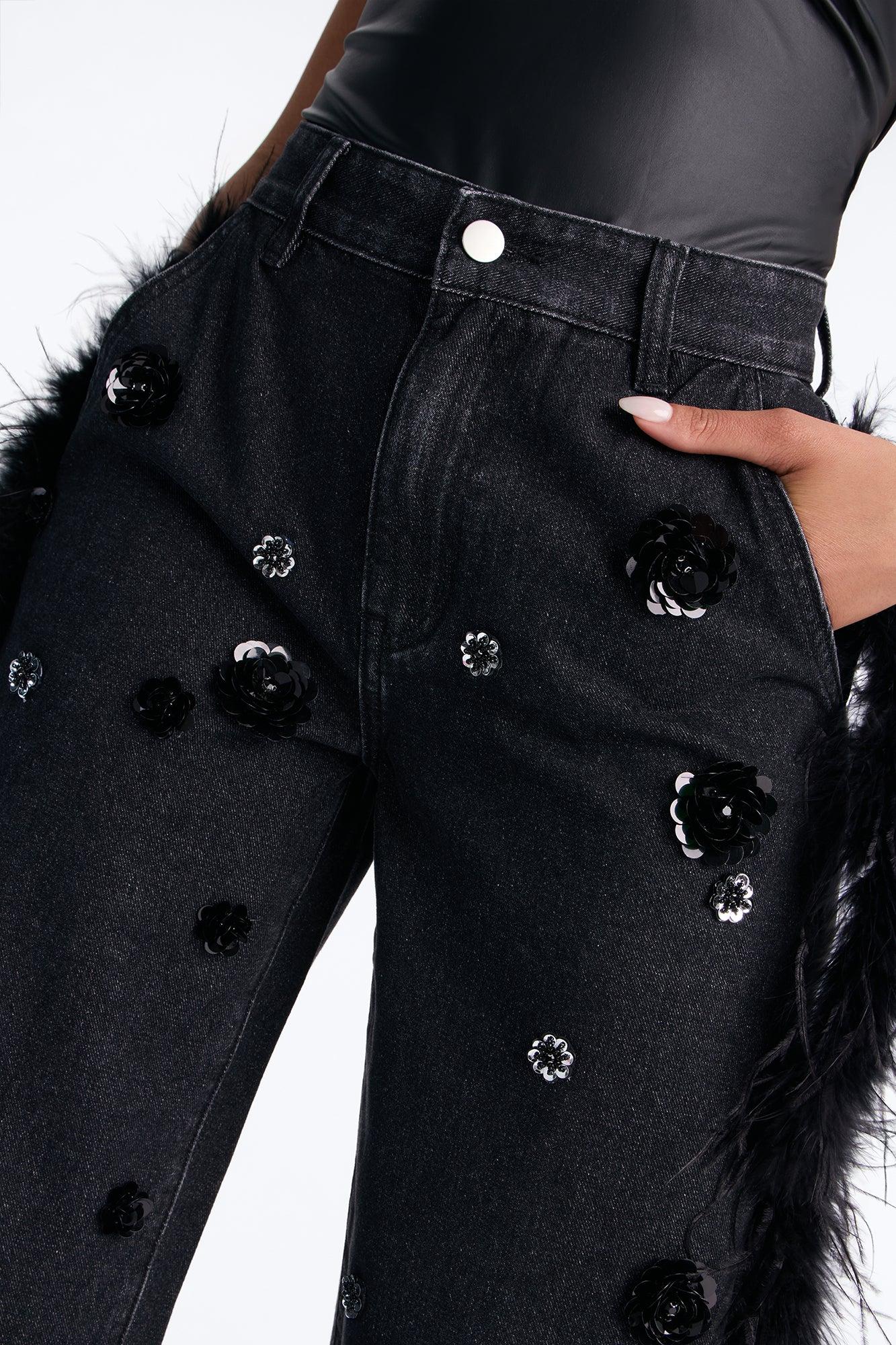 Available In Black Wash. Wide Leg Jean 4 Pocket Front Zipper And Button Closure Faux Feather Trim Floral Embellishment 11" Rise 34" Inseam Non-Stretch Disclaimer: Feather Fall Out May Happen. Shell: 90% Cotton 10% Viscose Decoration: 100% Ostrich Feather Imported