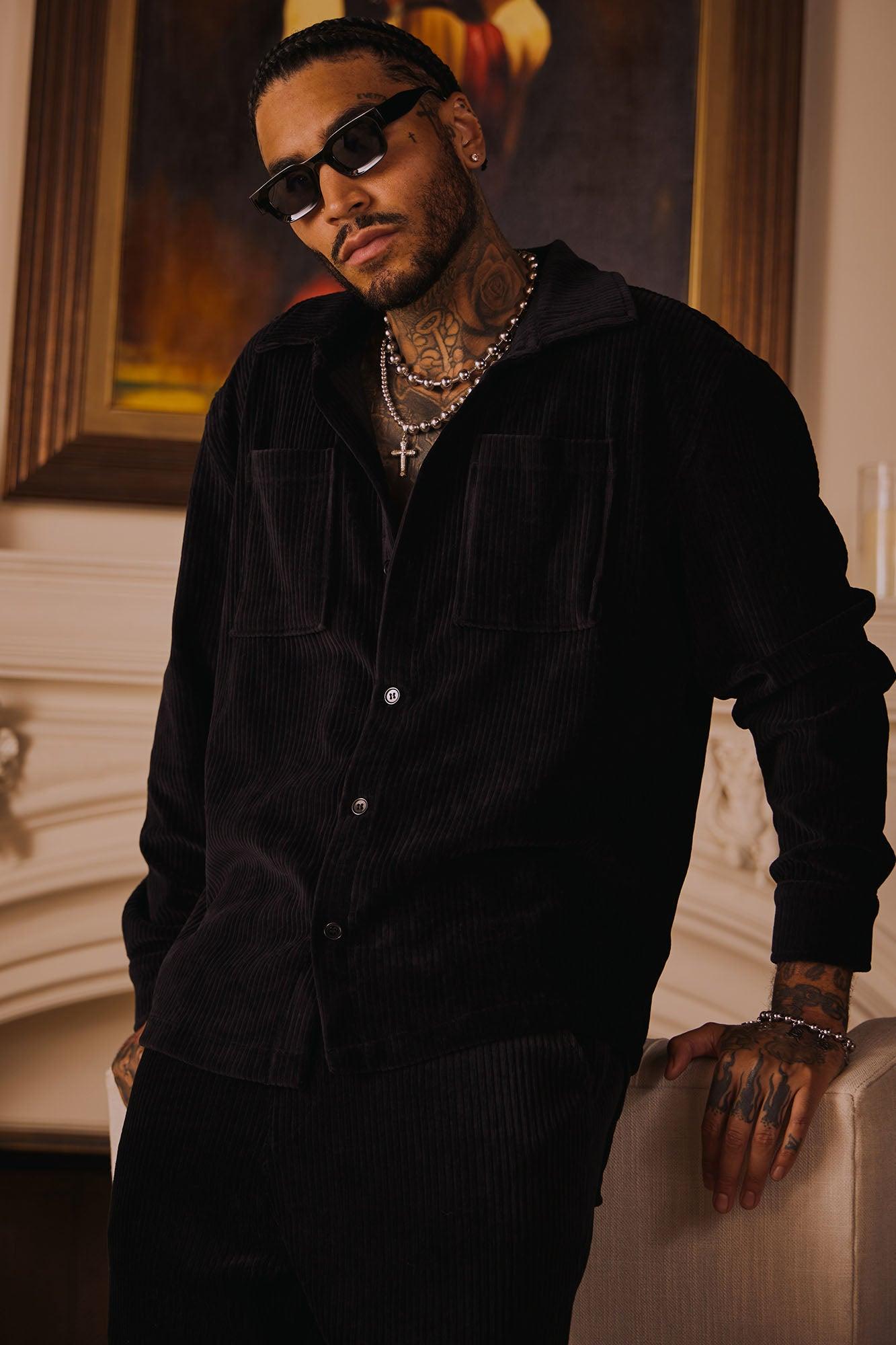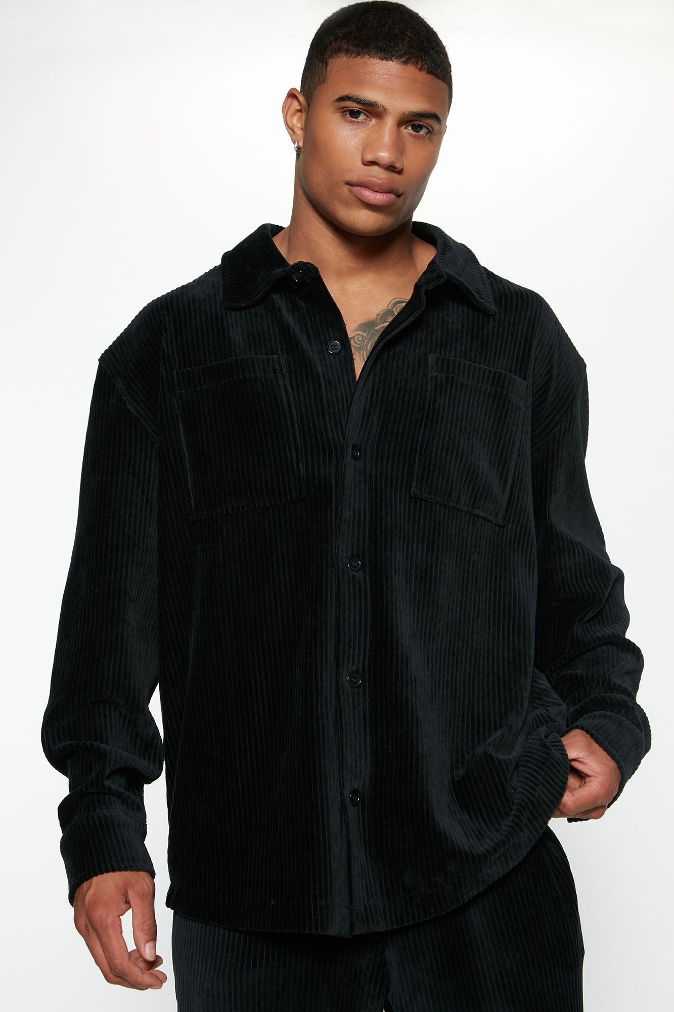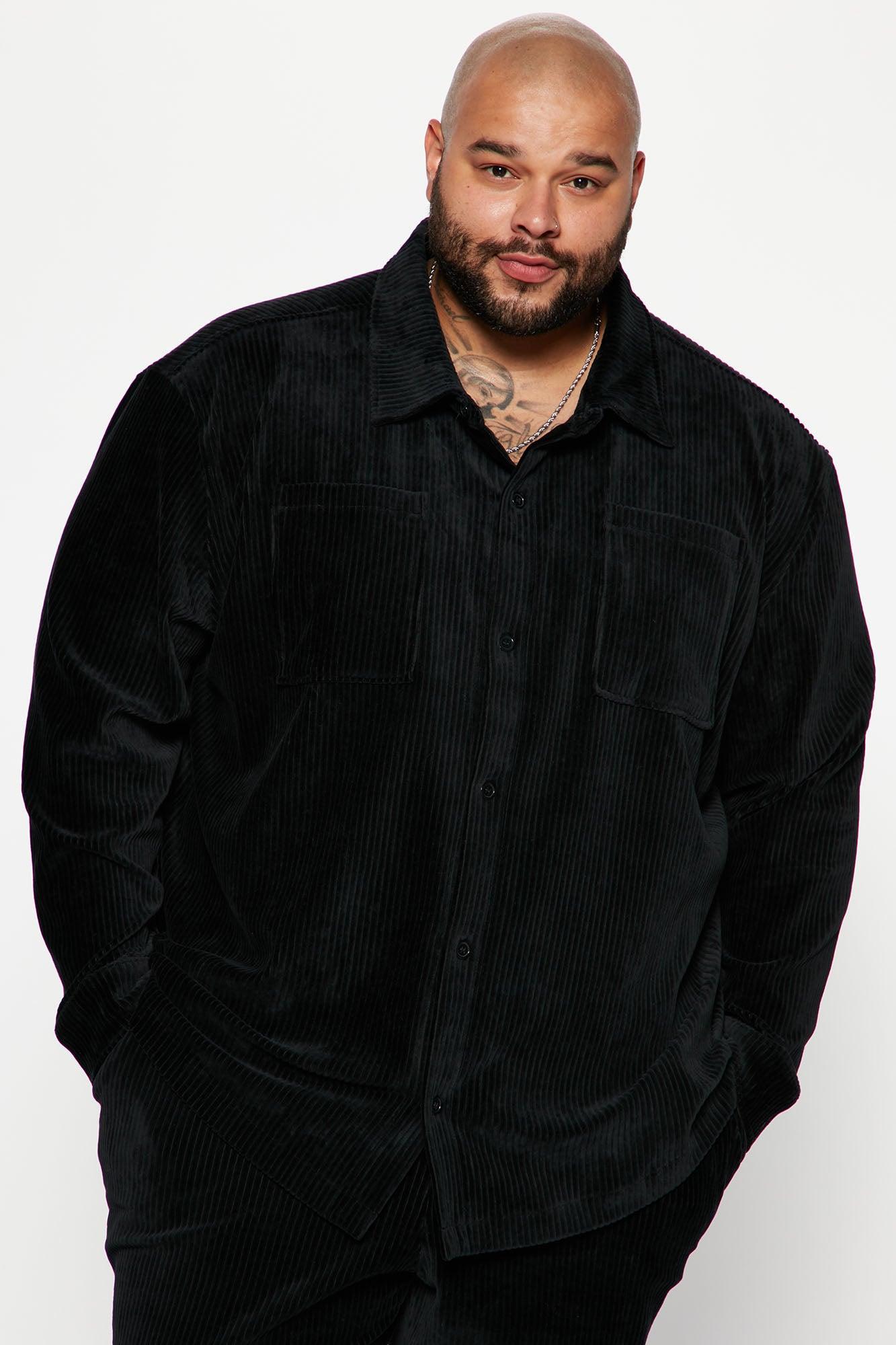 Model Height: 6'2 - Wearing Large Big & Tall: Height 6'3- Wearing XXXL Available In Black. Fold Down Collar Front Chest Pockets Front Button Closure Pair With "Luxury Knit Pants" Disclaimer: Runs Big, Shop One Size Down 65% Cotton, 32% Polyester, 3% Spandex Imported