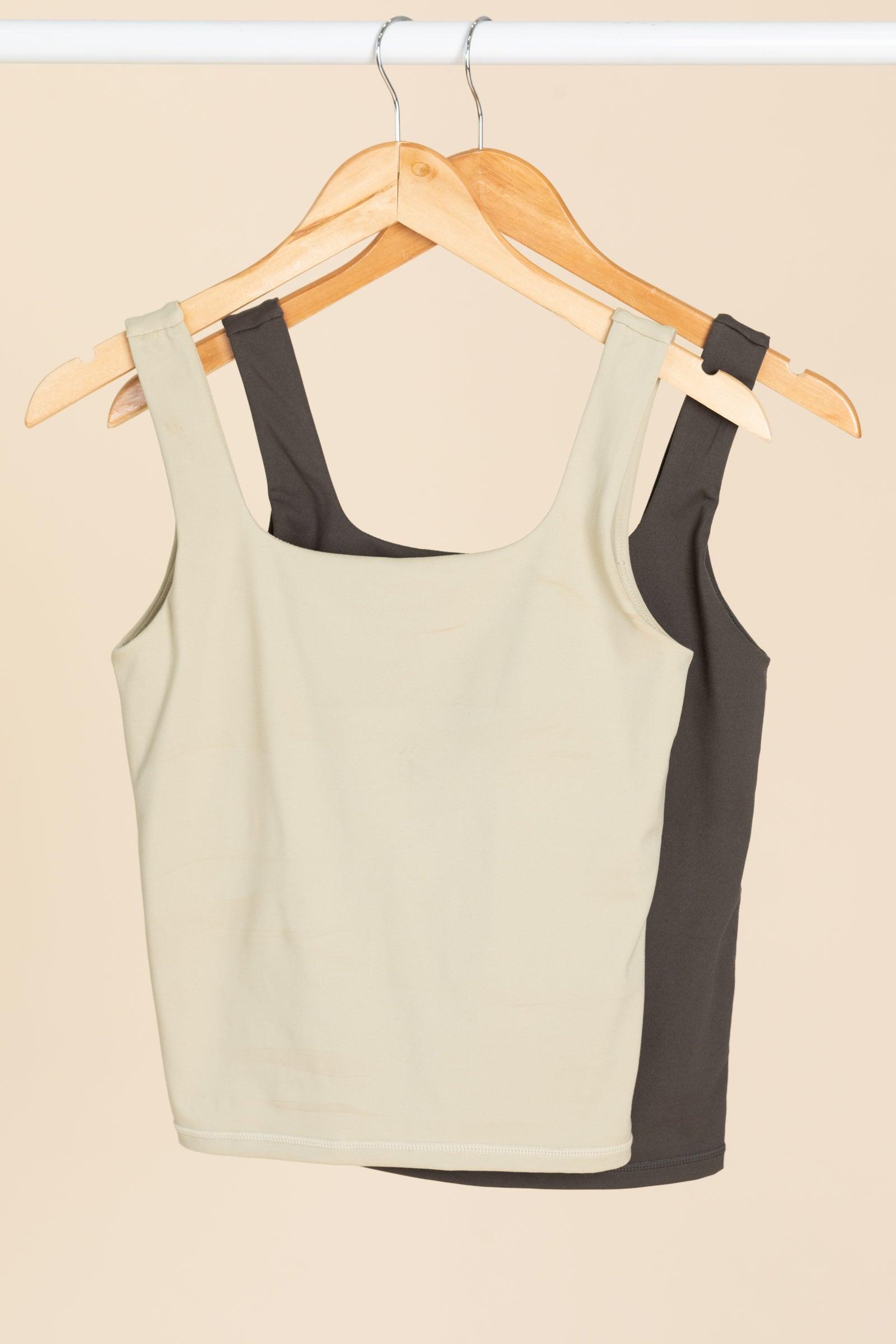 Product Details Colors: Black Olive/ Green Khaki Print: Solid Neckline: Square Neck Sleeve: Sleeveless Hemline: Straight Brand: Mono B Material and Care 76% Nylon 24% Lycra Machine Wash Cold Hang/Line Dry Size and Fit Small: Bust 28" Waist 26" Length 20" Medium: Bust 30" Waist 28" Length 20.5" Large: Bust 32" Waist 30" Length 21" Erica is 5’7” and wearing her true size small