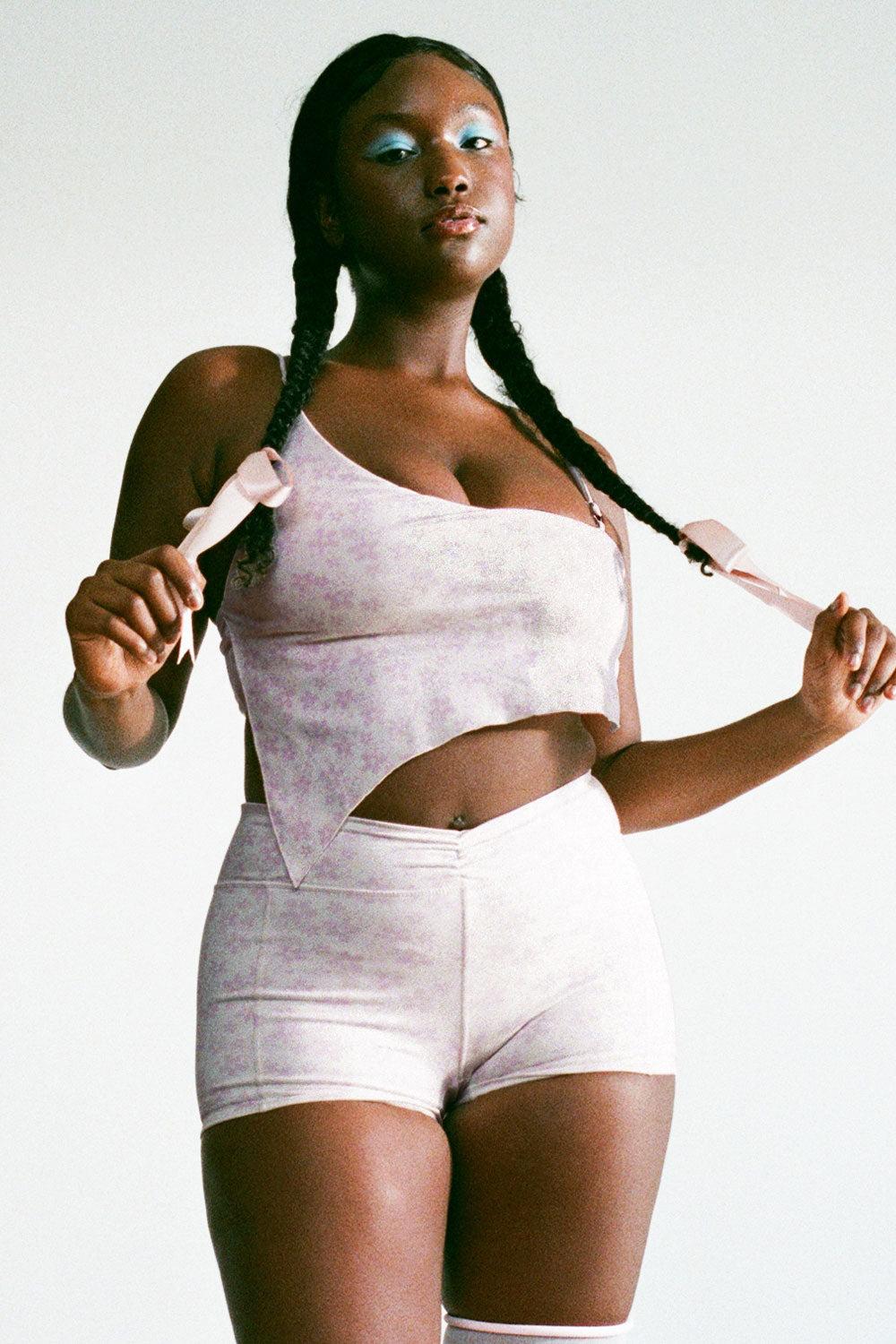 An on-trend, floral sports bra that doubles as a top, meet Lydia. Lydia is designed with a built-in shelf bra, an asymmetrical cut, adjustable straps, the softest fabric, and our signature Frankies Bikinis activewear logo. Wear the Lydia sports bra with the Rehearsal short for any workout, or with a pair of blue jeans for any sunny outting. Feel good wearing this, as it's designed in our more sustainable fabric, made of 80% recycled polyester. Fabric 80% Recycled Polyester + 20% Spandex Adjustable Straps Model Size & Fit This style runs true to size Sephira is wearing a size Small Height 5’8.5” (174cm) Bust 32" (81cm), Waist 26” (66cm), Hips 31.5 (80cm) Tatianna is wearing a size X-Large Height 5’10” (178cm) Bust 43" (109cm), Waist 33'' (83.82cm), Hips 47” (119cm)