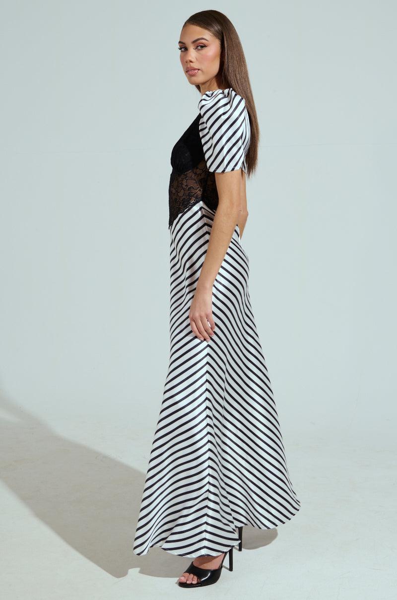 A lil bit of sweet, and a lil bit of sexy. The AKIRA Label Lydia Lace And Satin Maxi Dress is crafted from a silky smooth satin and features a bold, two-tone striped chevron pattern throughout, a plunging V-neckline, slightly puffy short sleeves, a sheer lace bodice with lining on the bust, and a flowing maxi length skirt. Complete with a concealed back zip closure, and a sheath-style silhouette. Pair with stiletto sandals and a clutch for a finished look. - Shell: 100% Polyester, Lining: 84% Polyester 16% Spandex- Slight Stretch- Imported (all measurements approximate from size small)- 62” Shoulder to Hem- 14” Shoulder to Shoulder- 12” Sleeves- Model is 5’10” and is wearing size small Product ID: 1027677