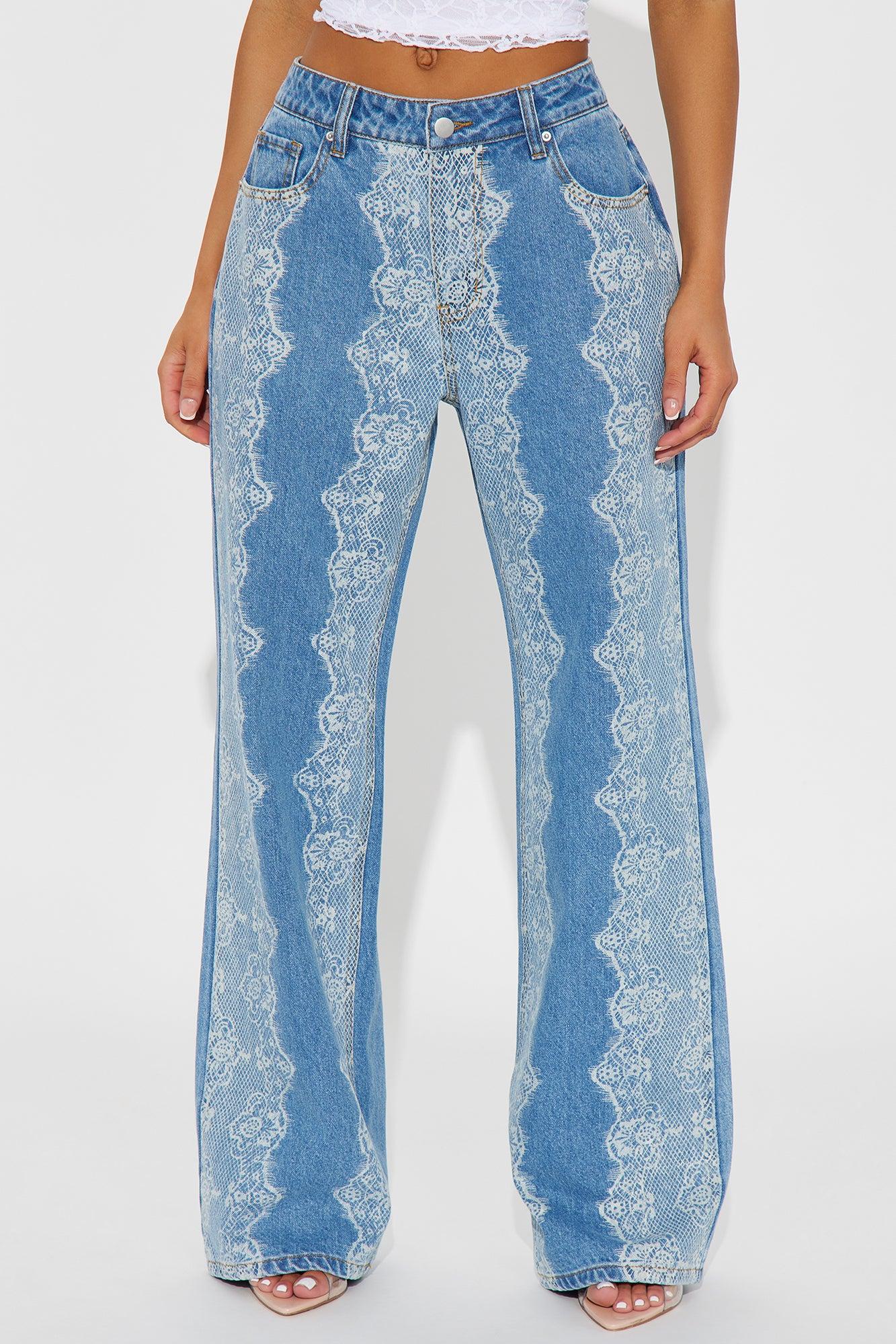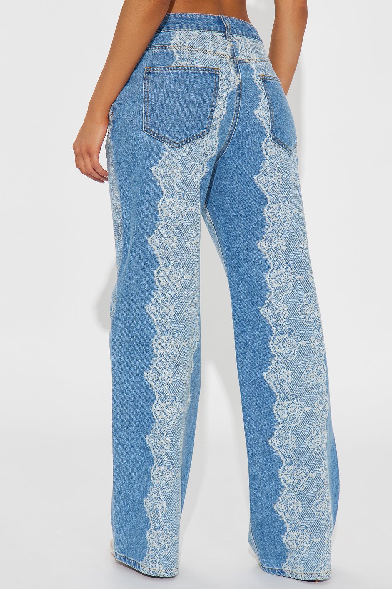 Available In Medium Wash. Straight Leg Jean 5 Pocket Faux Lace Print 11" High Rise 32" Inseam Non-Stretch Disclaimer: Due To The Specialized Wash Process, Each Garment Is Unique, and Lace Pattern Will Vary 100% Cotton Imported California Proposition 65WARNING: Cancer and Reproductive Harm - www.P65Warnings.ca.gov.