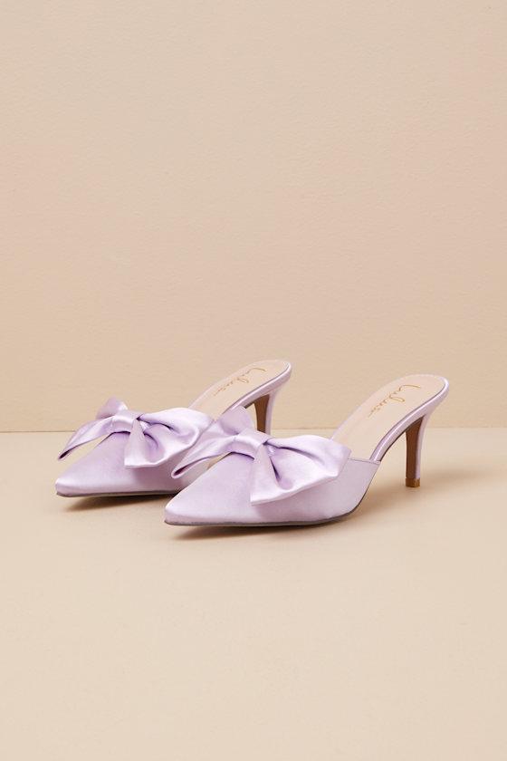 To achieve a sweet and chic look, start with the Lulus Lyle Lilac Satin Pointed-Toe Mules! Sleek satin shapes these darling mules that have a pointed-toe upper with a matching bow at the vamp, all atop a low stiletto heel. Slide-on design makes these mules a breeze to wear!
