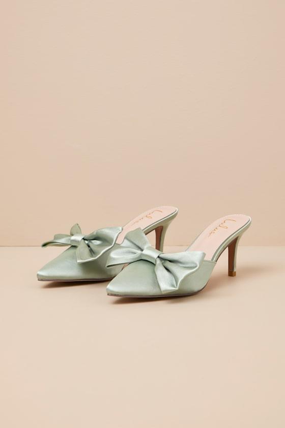 To achieve a sweet and chic look, start with the Lulus Lyle Sage Green Satin Pointed-Toe Mules! Sleek satin shapes these darling mules that have a pointed-toe upper with a matching bow at the vamp, all atop a low stiletto heel. Slide-on design makes these mules a breeze to wear!