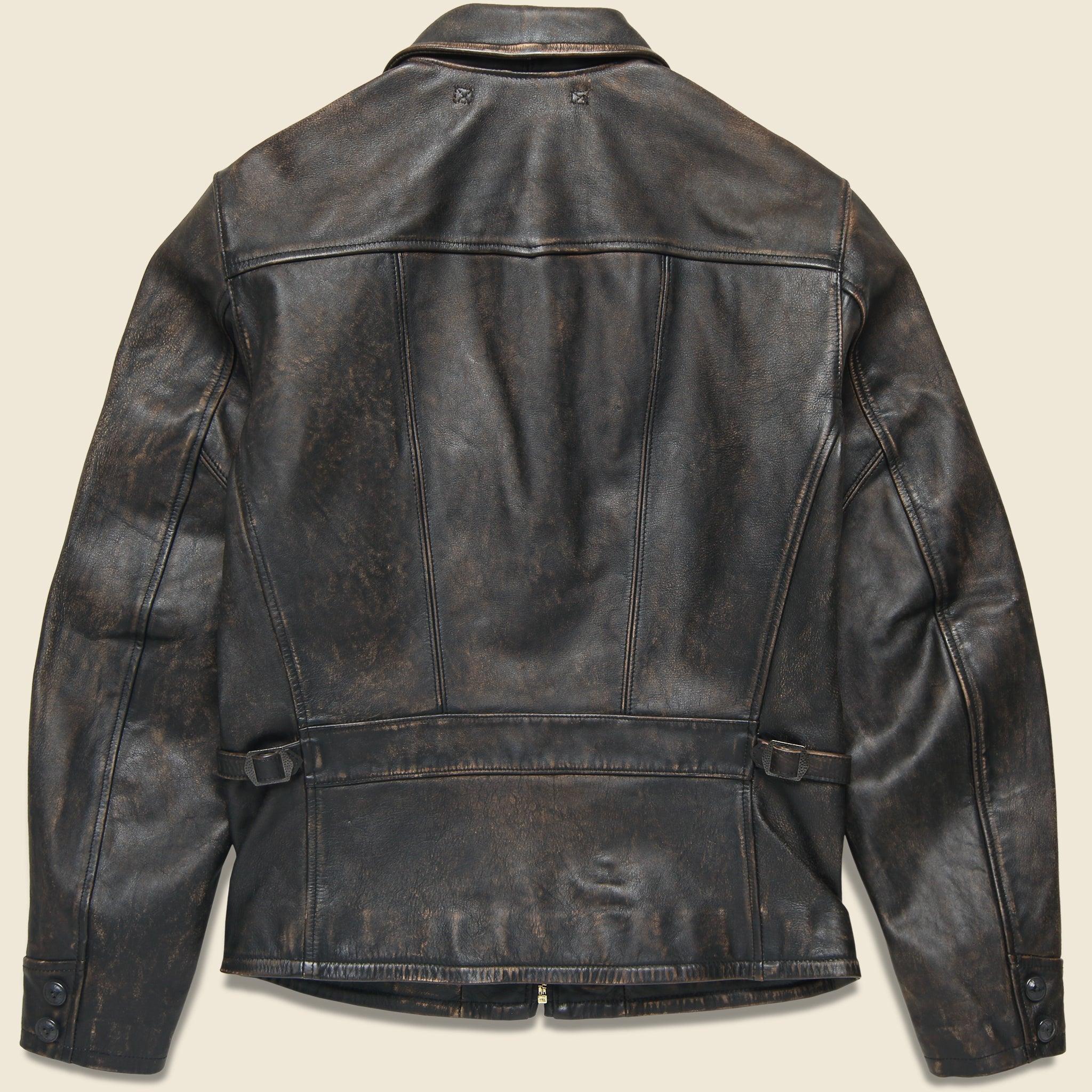 The Lynton Moto Jacket from Double RL is crafted from full-grain cowhide that’s been finished with a black-over-brown hue and carefully distressed to allow it to continue to uniquely age with wear. Finished with a yarn-dyed checked twill at the interior for added comfort, moleskin-lined hand-warmer pockets, and custom brass hardware. Vegetable-tanned leather Black-over-brown hue Hand-distressed to uniquely age over time Spread collar Full-zip front Long sleeves with button details Moleskin-lined handwarmer pockets Exterior left chest pocket, interior left waist pocket Adjustable buckled tabs at the back waist Relaxed fit that runs true to size We recommend taking your normal size Materials: Shell: 100% leather | Lining: cupro, cotton The following measurements are for size Medium: Chest: 45 ½” | Shoulder: 19” | Sleeve: 34 ½” | Length: 27”