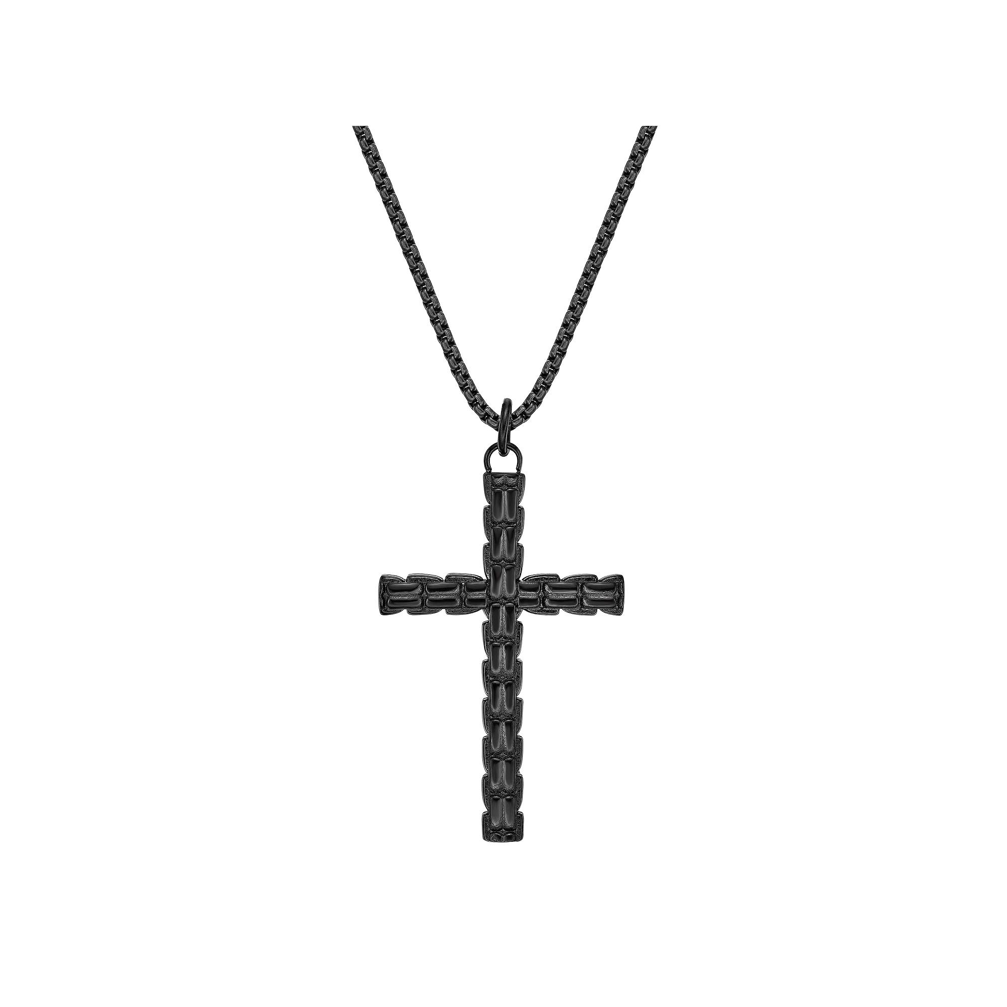 Designed to stand out, this LYNX stainless steel cross pendant necklace is a bold pick. Designed to stand out, this LYNX stainless steel cross pendant necklace is a bold pick. Metal: stainless steel Length: 24 in. Packaging: pouch Plating: black ion plated Finish: polished Pendant size: 2.12"L x 1.3"W Chain type: box Size: 24". Gender: male. Age Group: adult.