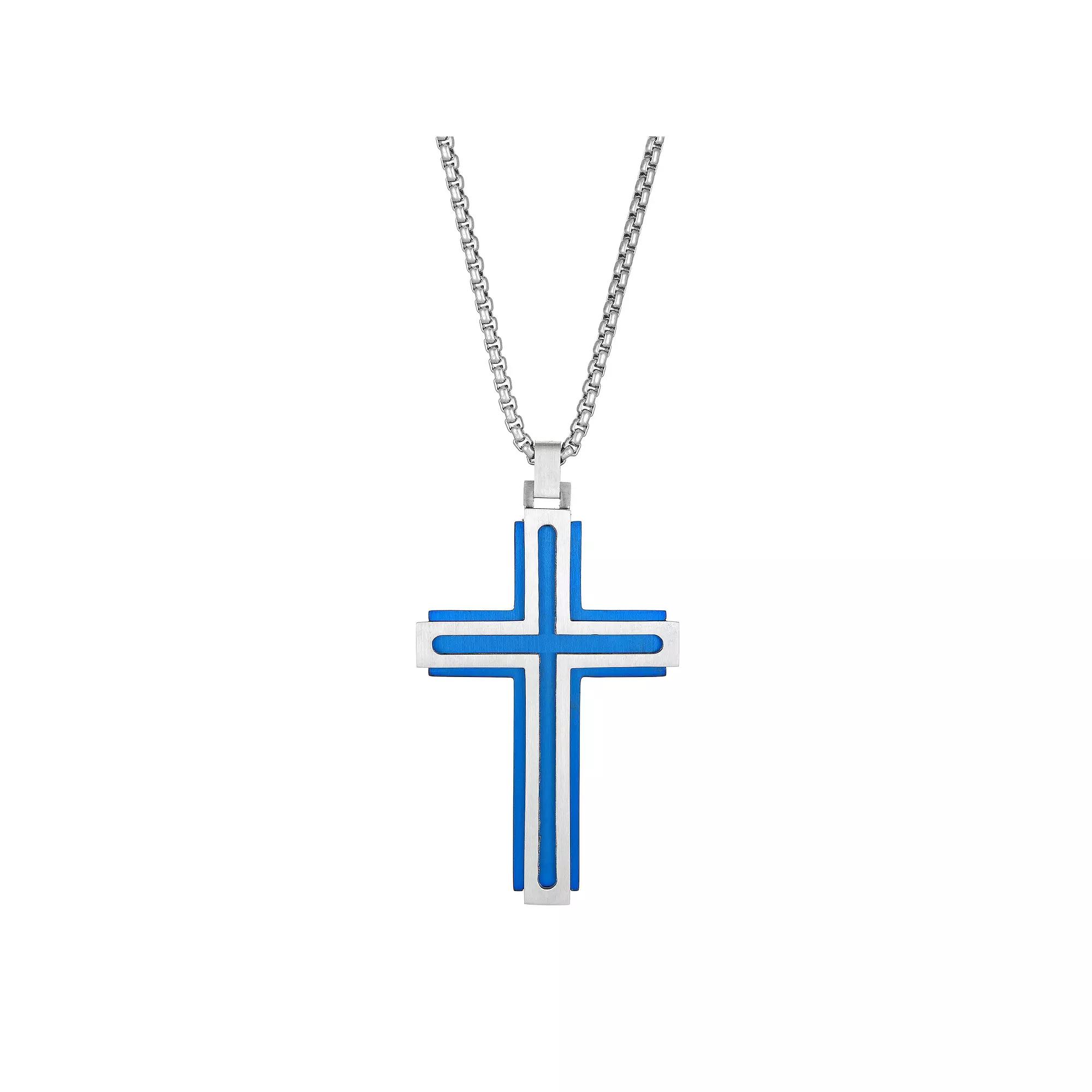 Keep your faith close at all times with this blue ion-plated stainless steel cross pendant necklace. Keep your faith close at all times with this blue ion-plated stainless steel cross pendant necklace. Pendant size: 2.05 x 1.18 Chain length: 24 in. Chain type: box Metal: stainless steel Plating: blue ion-plated Finish: polished Packaging: boxed Please note, due to the high value of this item, a signature may be required upon delivery. Size: 24. Color: Multicolor. Gender: male. Age Group: adult.