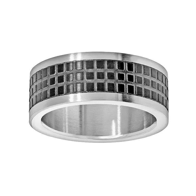 A black ion-plated stainless steel grid set in a stainless steel band makes this mens LYNX ring a striking choice.RING DETAILS Width: 9 mm Metal: stainless steel, black ion-plated stainless steel Size: 11. Gender: male. Age Group: adult.