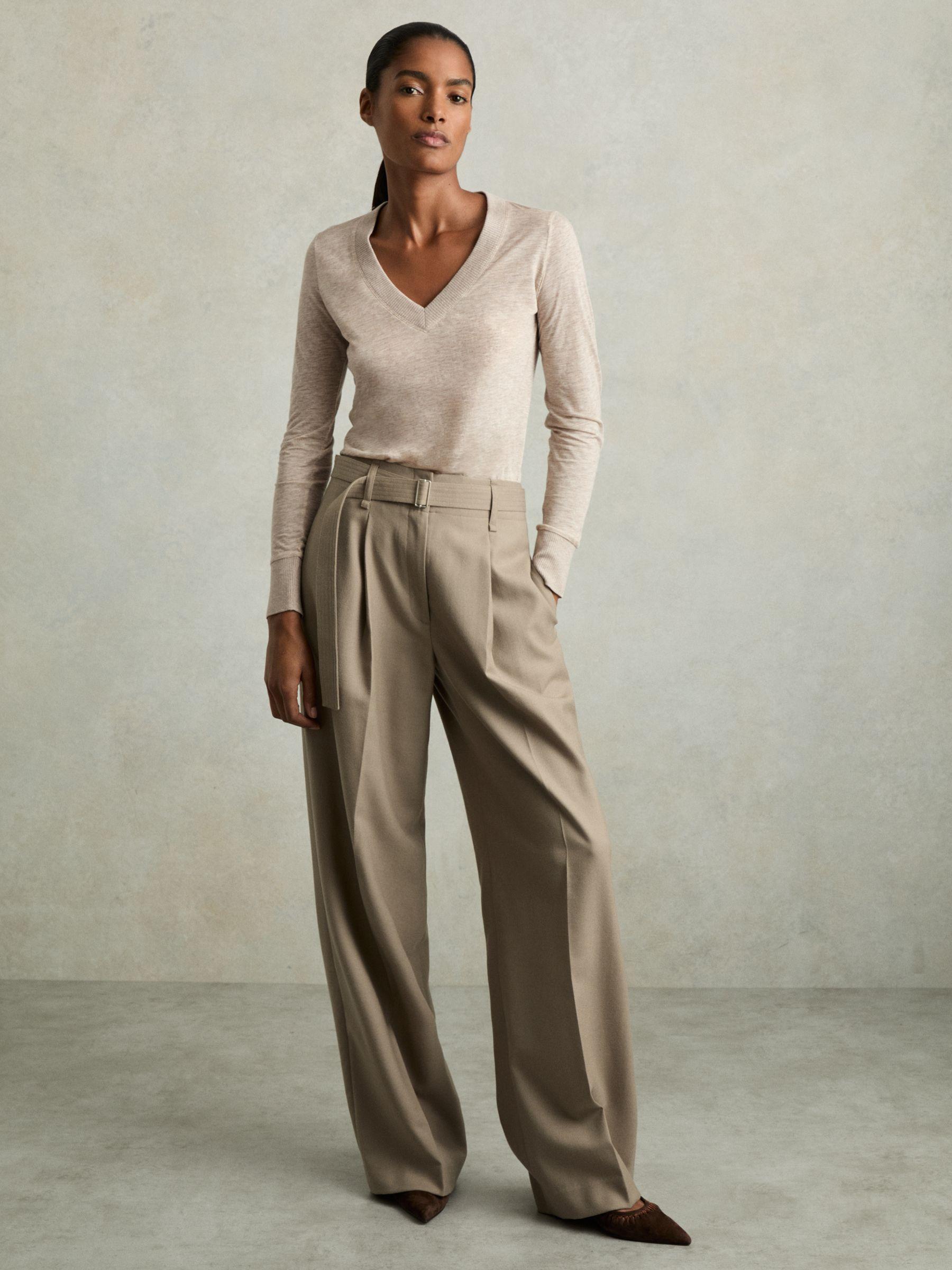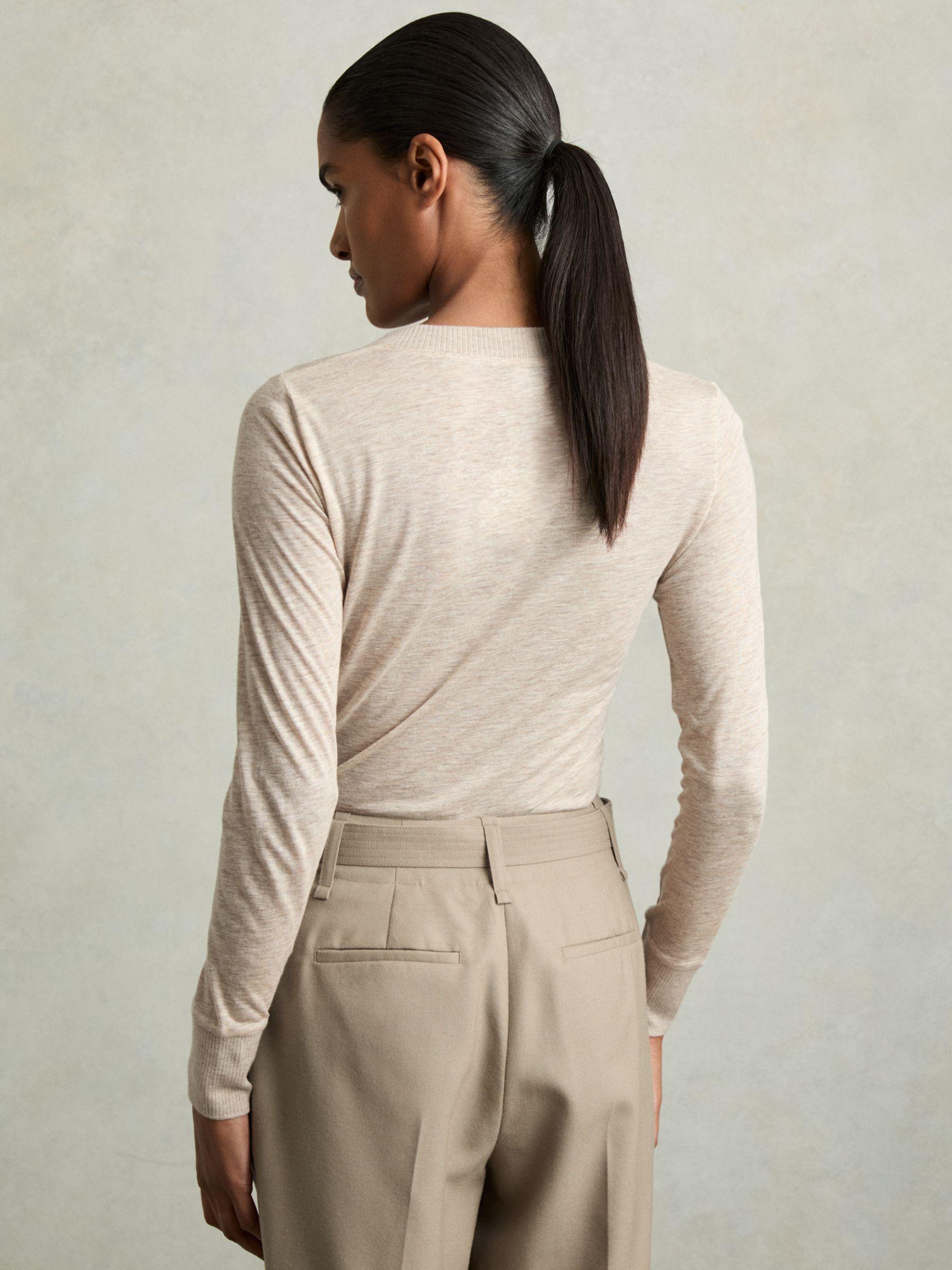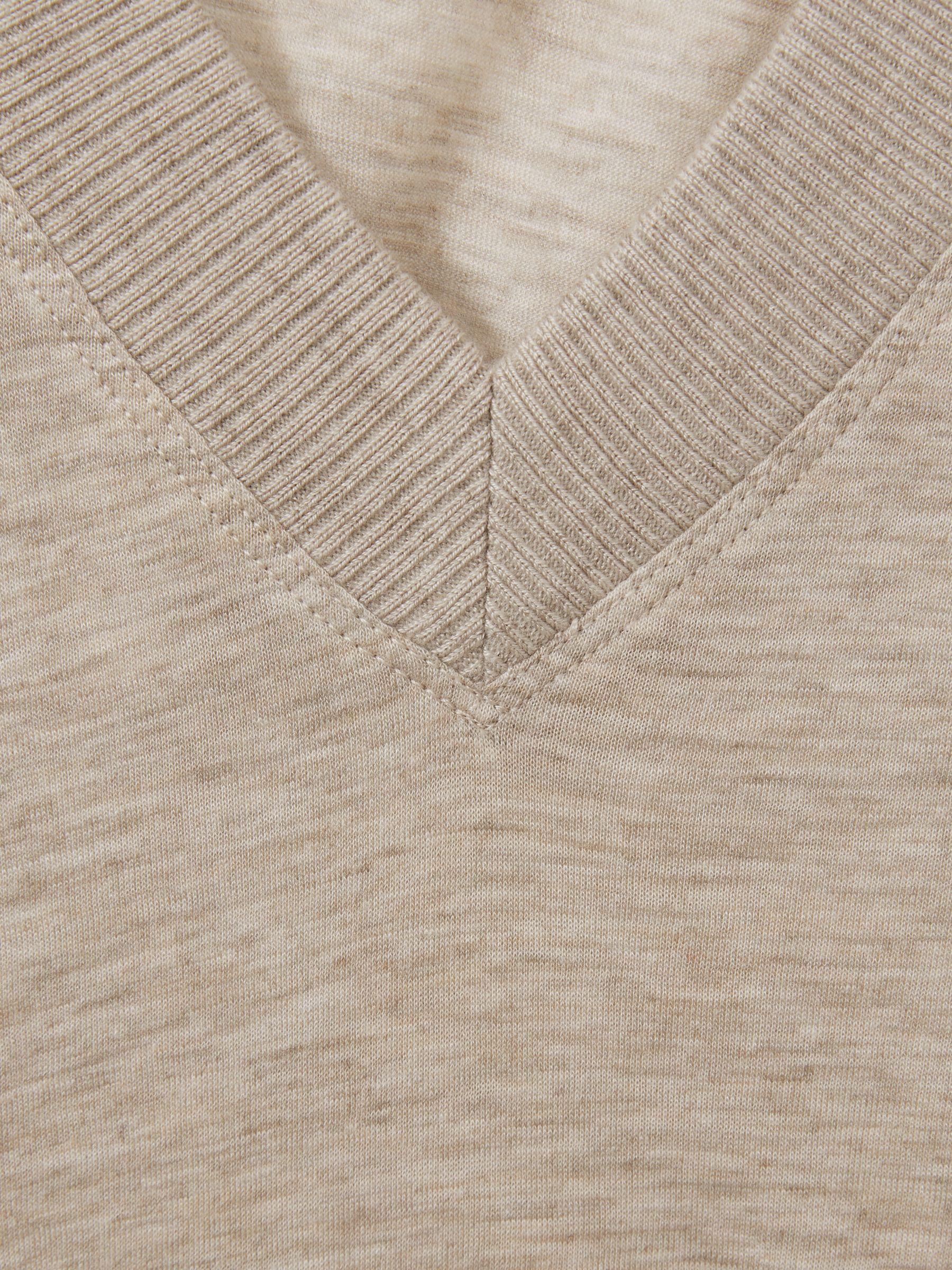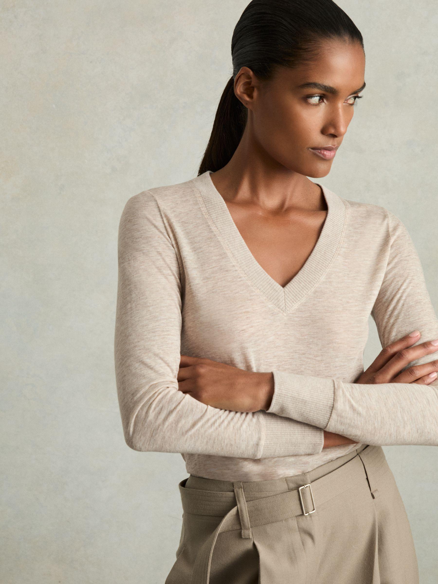 The Evelyn top has a lightweight knitted construction, spun from a marled lyocell-wool blend. It s fitted with a V-neckline and ribbed trims, which are ideal for layering in the coming months. Lyocell-wool blend. Marled finish. V-neckline. Ribbed trims.