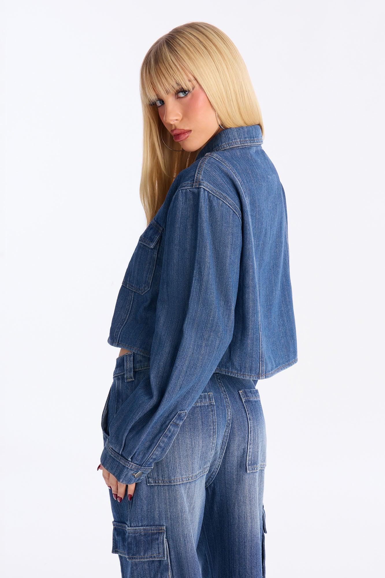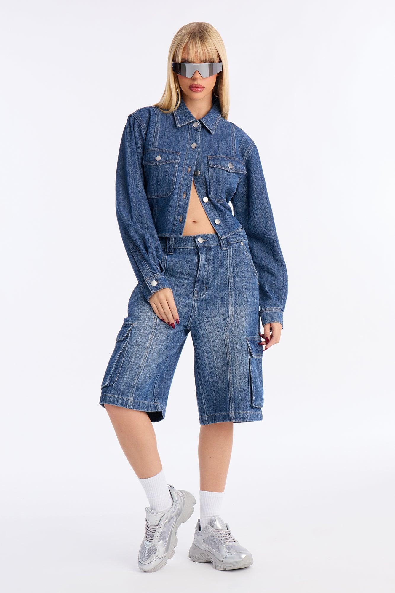 Available In Medium Wash. Pair With Lyon Cargo Denim Jorts Denim Shacket Collar Button Closure Chest Pockets Cropped Jacquard Denim Rigid Disclaimer: Due To The Specialized Wash, Each Garment Is Unique. Self: 80% Cotton 20% Polyester Imported California Proposition 65WARNING: Cancer and Reproductive Harm - www.P65Warnings.ca.gov.