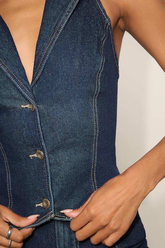 You'll be set for a summer of compliments when you have this vest-inspired top, crafted with slightly stretchy denim and a sophisticated dark wash hue. The halter neckline boasts a chic collared bodice with a button-front and figure-fitting silhouette that finishes with pointed hems. Contrast seaming lends a stylish finish. Pair with the matching shorts for a complete look!