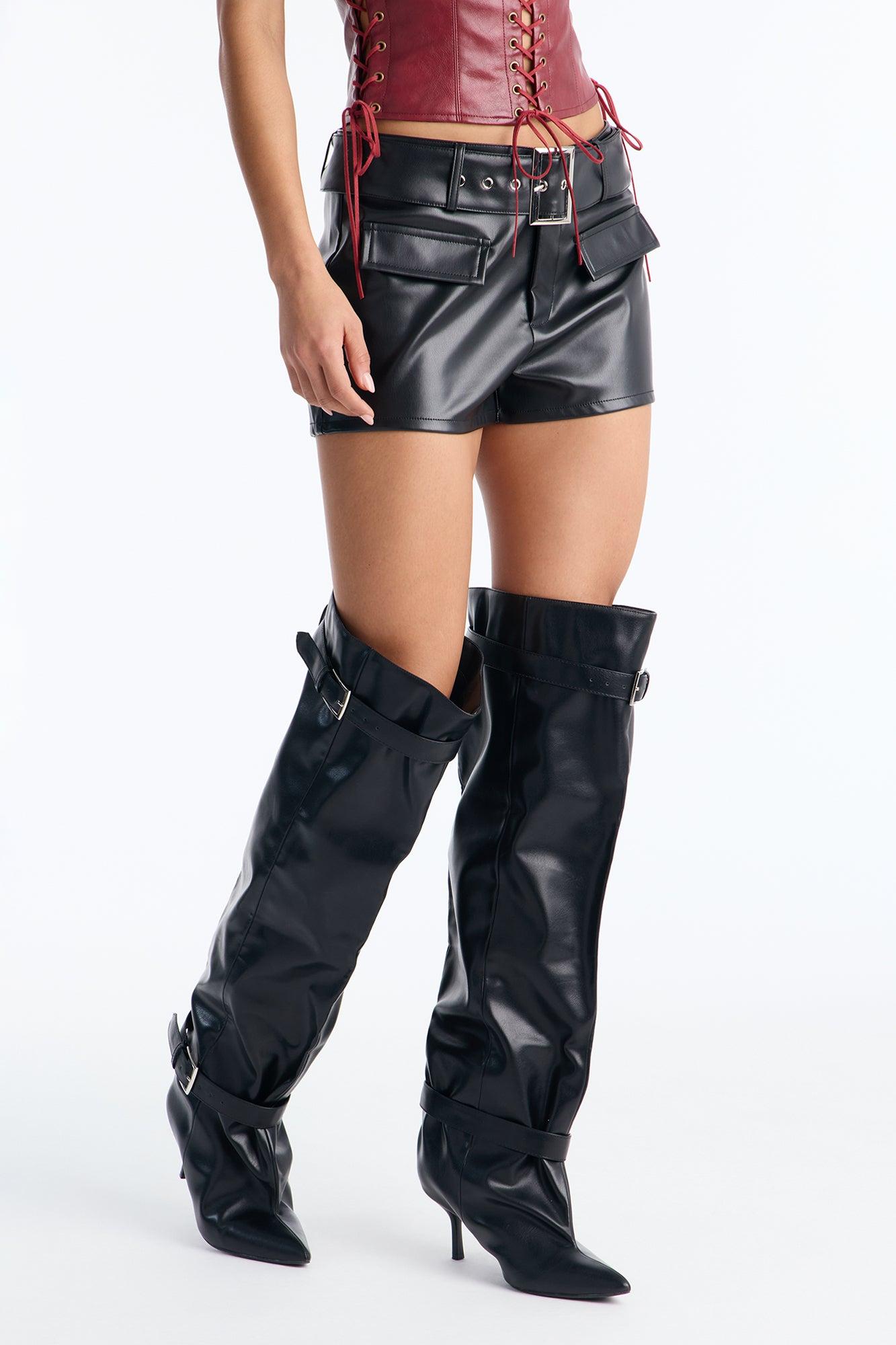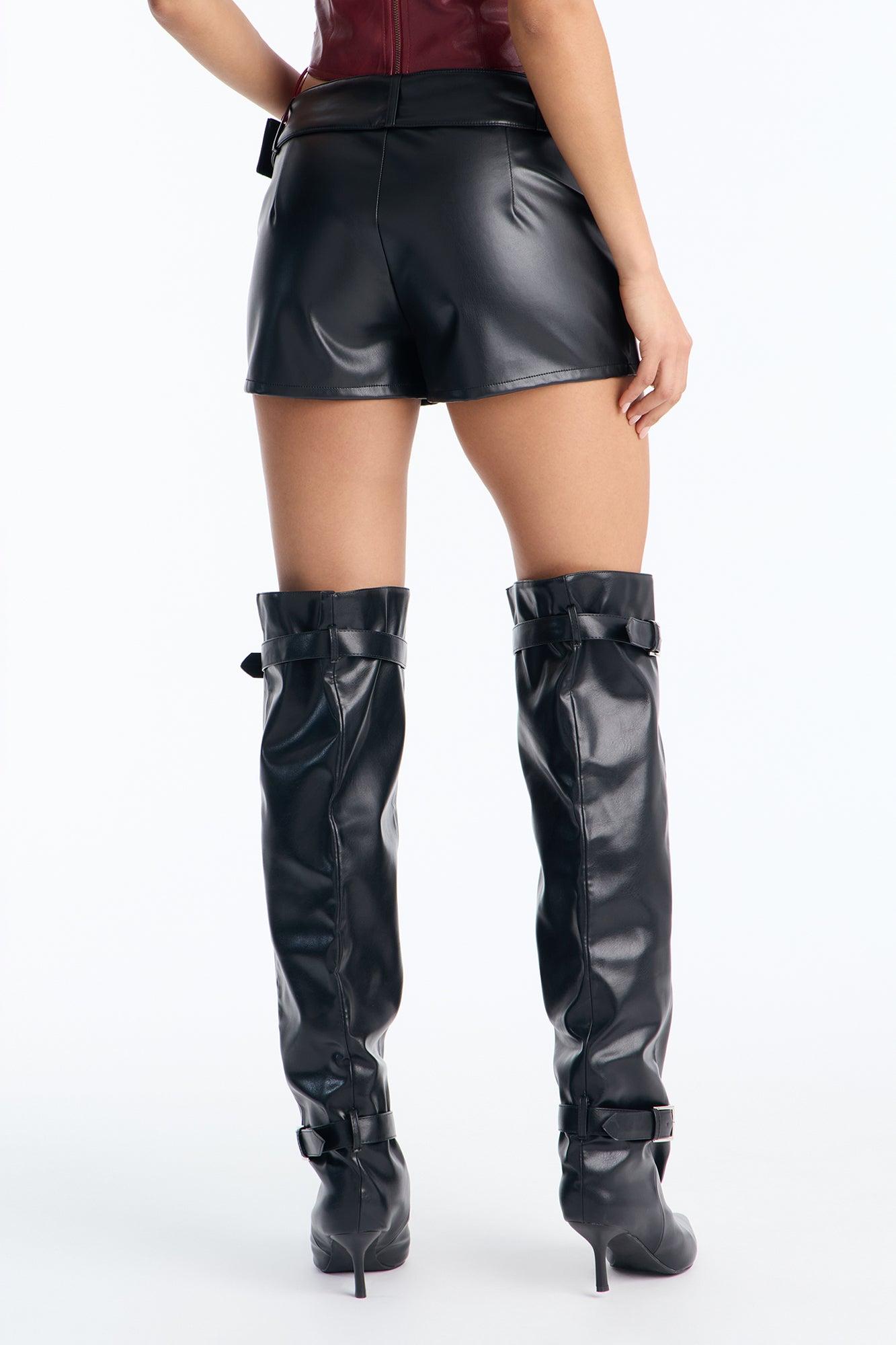Available In Black And Red. Hot Short Hook and Eye Closure Mid Rise Belted Faux Pocket Welts Faux Leather 1.5" Inseam Self: 50% Polyurethane 50% Polyester Imported California Proposition 65WARNING: Cancer and Reproductive Harm - www.P65Warnings.ca.gov.