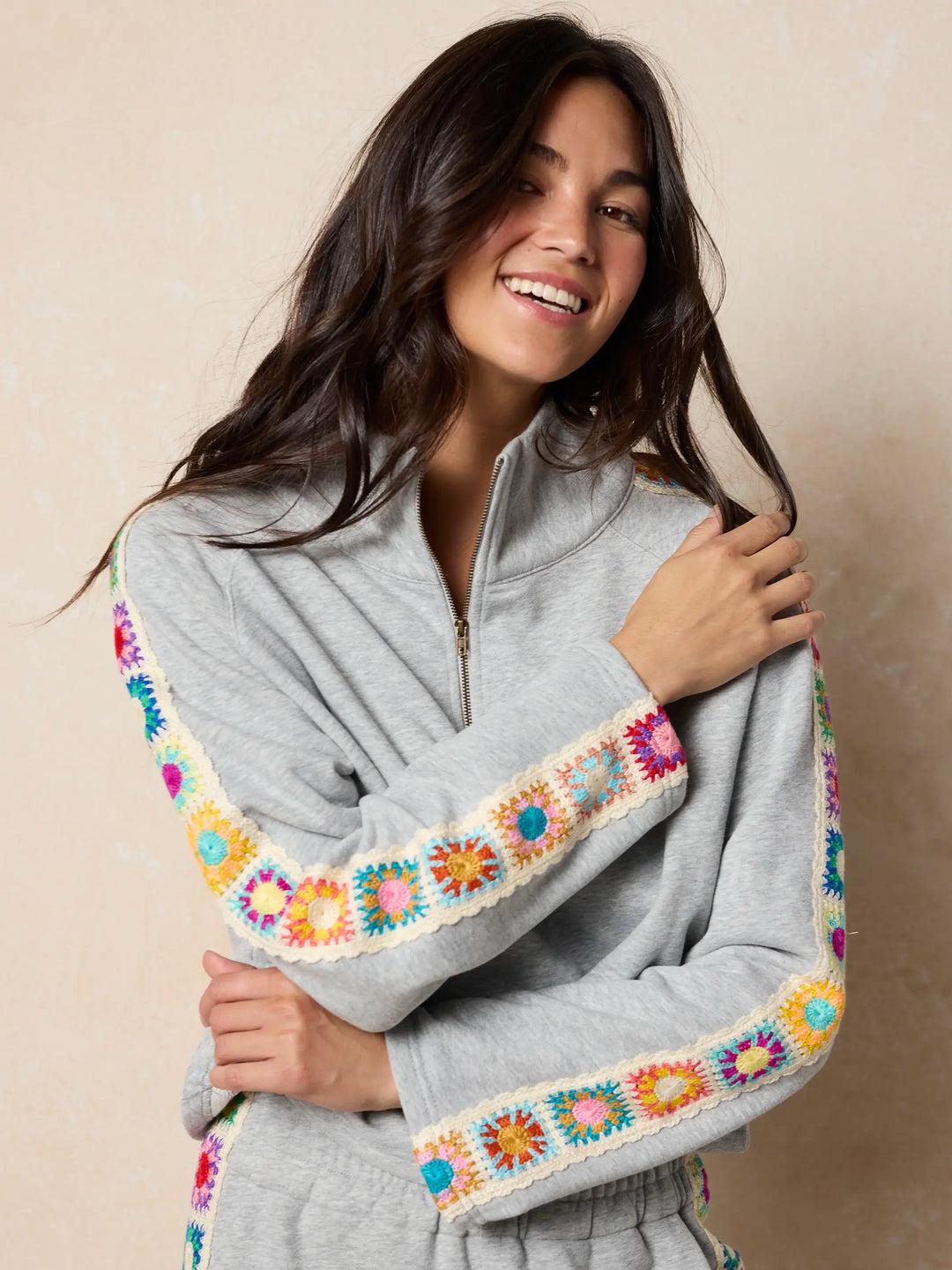 The material is thick, super comfy, and the fit is perfect! Love the crochet trim running down each sleeve. Pair it with the matching pants for the ultimate cozy-cute set.