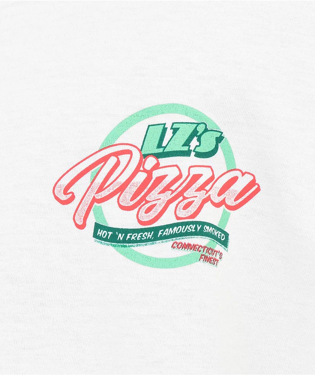 The LZMFG Pizza t-shirt comes in a natural cotton colorway, featuring a yellow JDM car delivering pizzas. "LZ's Pizza" graphics can be seen on the front back, as the 100% cotton tee is finished with a ribbed neckline and a printed tag for comfort.