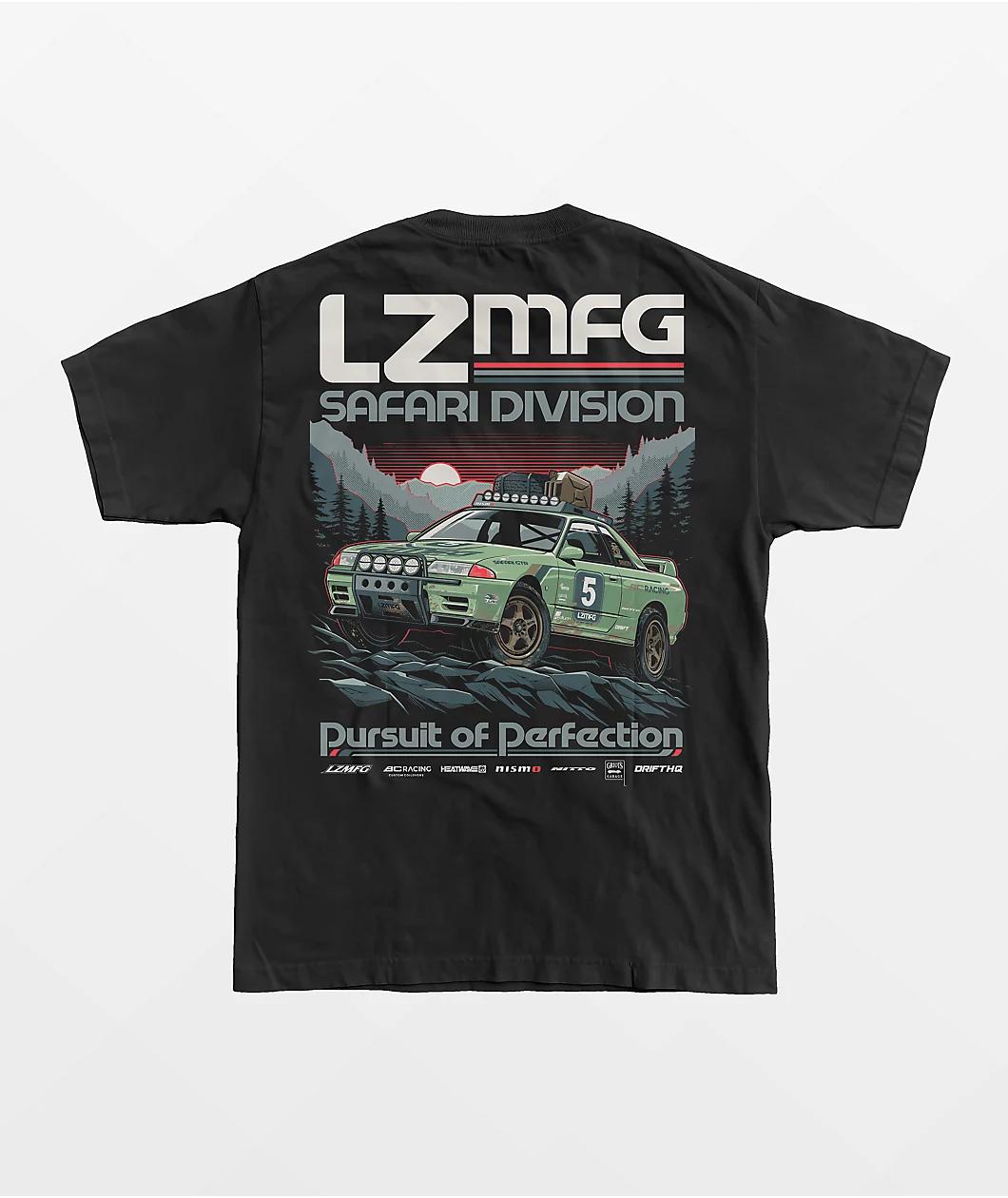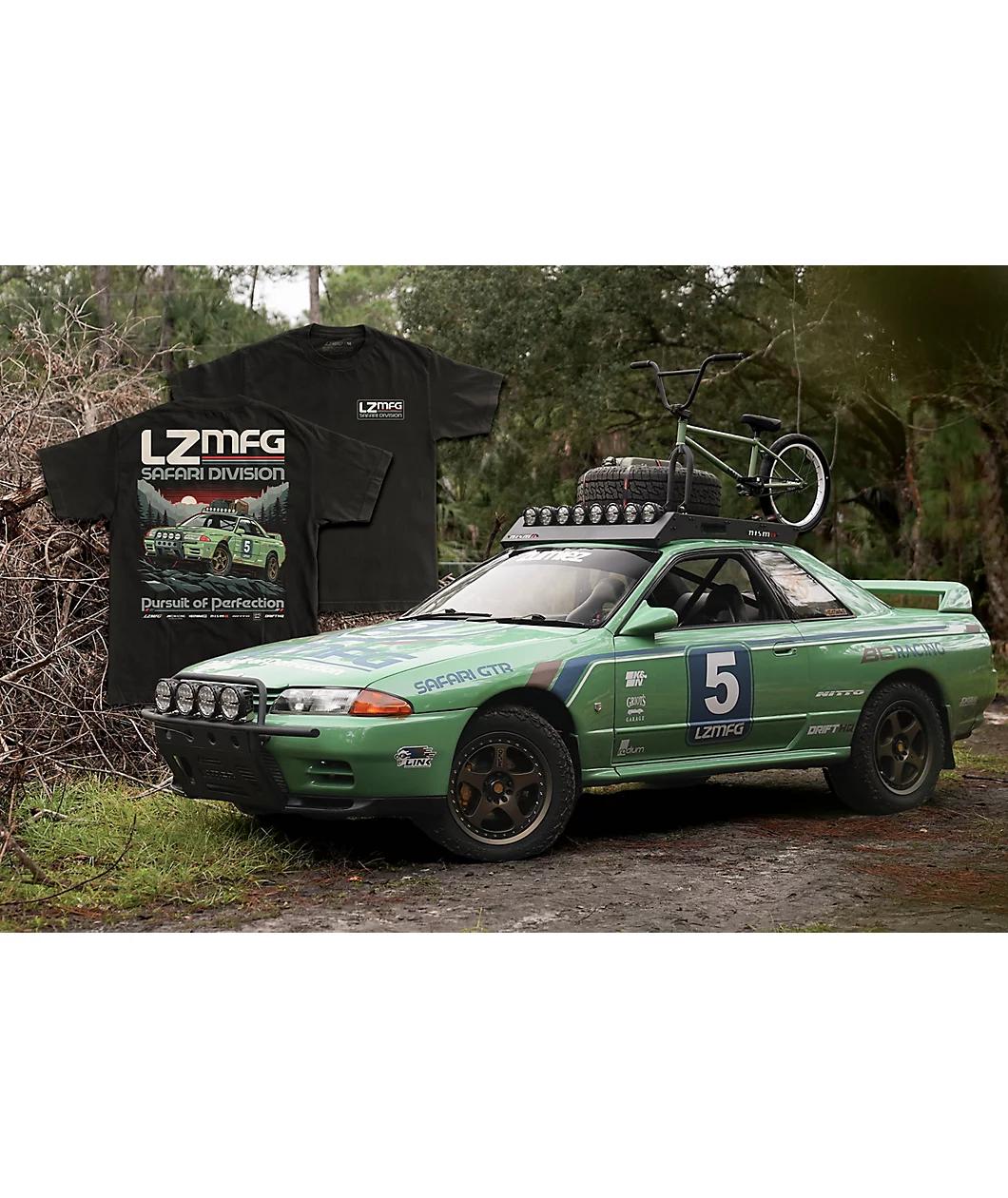 LZMFG offers the Safari Division GTR t-shirt in a durable cotton construction. The logo on the chest stands out amongst the solid black tee for a clean aesthetic. Cohesive to the front logo, the back offers a green JDM car driving through the off roa