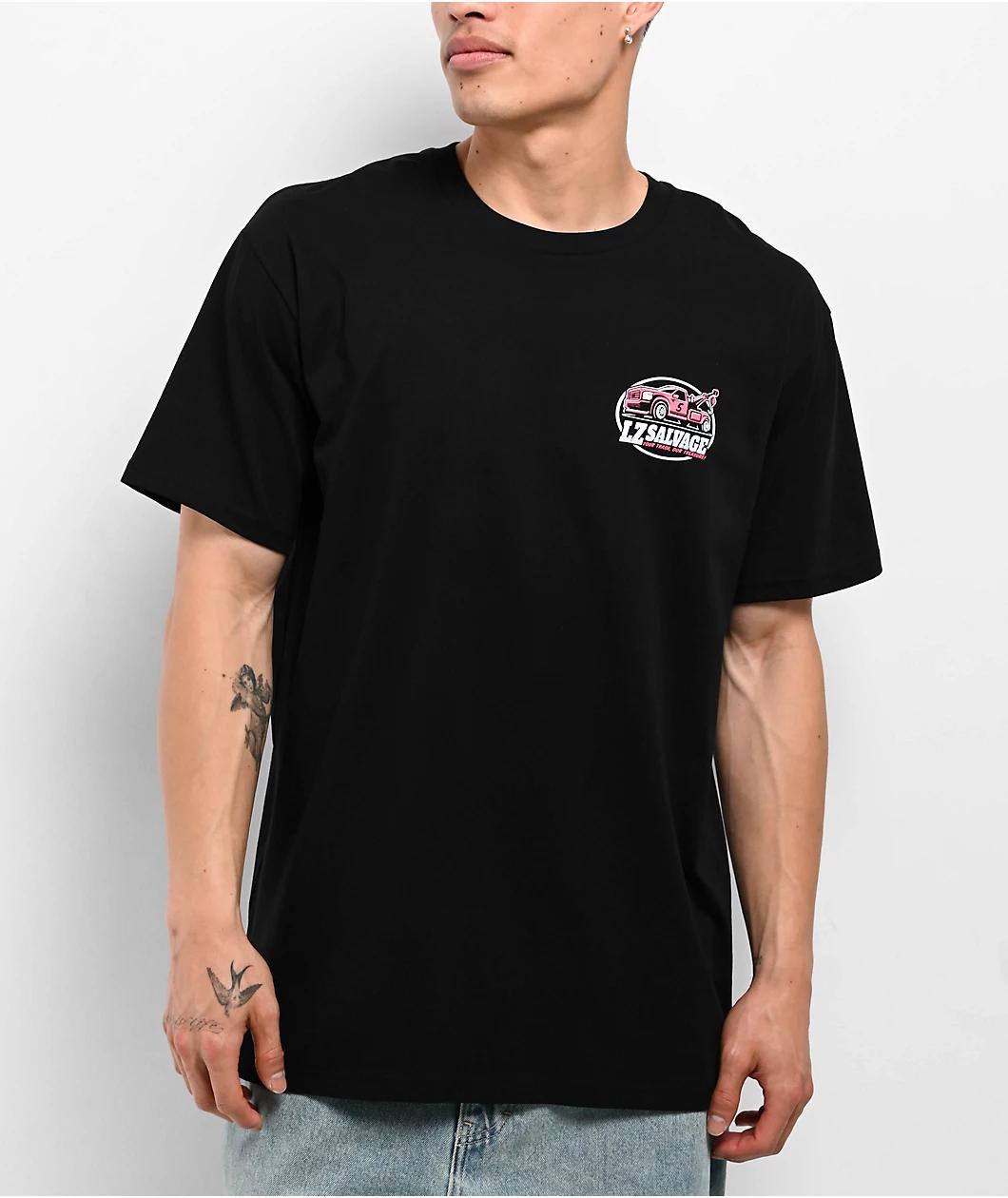 Fans of racing, cars, and motorsports will love the Salvage t-shirt from LZMFG. The black tee showcases branding for a faux Salvage company on the left chest and back, with the back further showcasing artwork of a wrecked racecar. A 100% cotton const