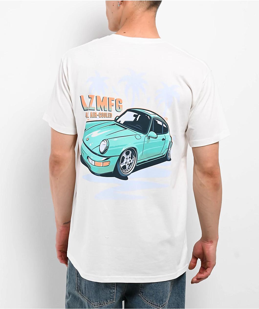 Automotive fans will enjoy the Toon t-shirt from LZMFG in a natural colorway. The left side of the chest showcases a 4.0L air cooled engine design, while the back embodies a bold German sports car in a vibrant colorway alongside palm trees for a trop
