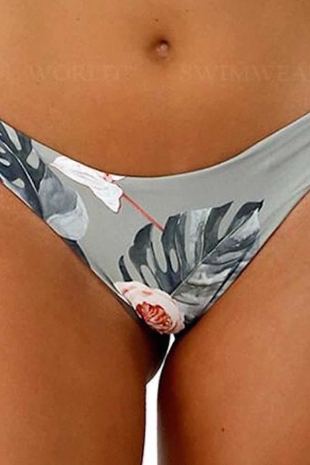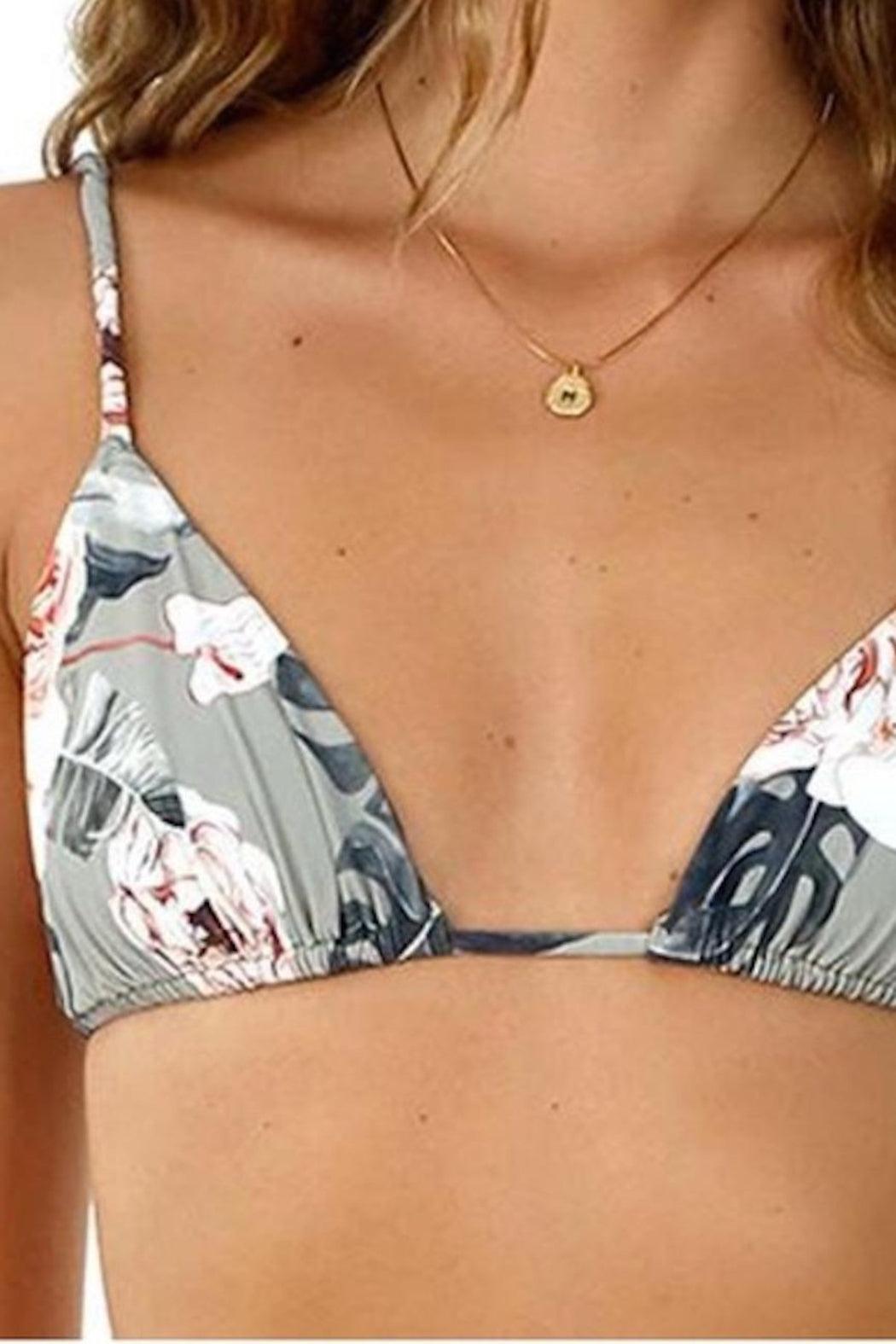 Malai Dharma Garden Curl Top and Elite Bottom Gray floral triangle top bikini. Adjustable straps. Ties at the back. Removable padding. Fully lined. Low rise bikini bottom. Cheeky coverage. Model stands 5'8" (177cm) and wears a size S.
