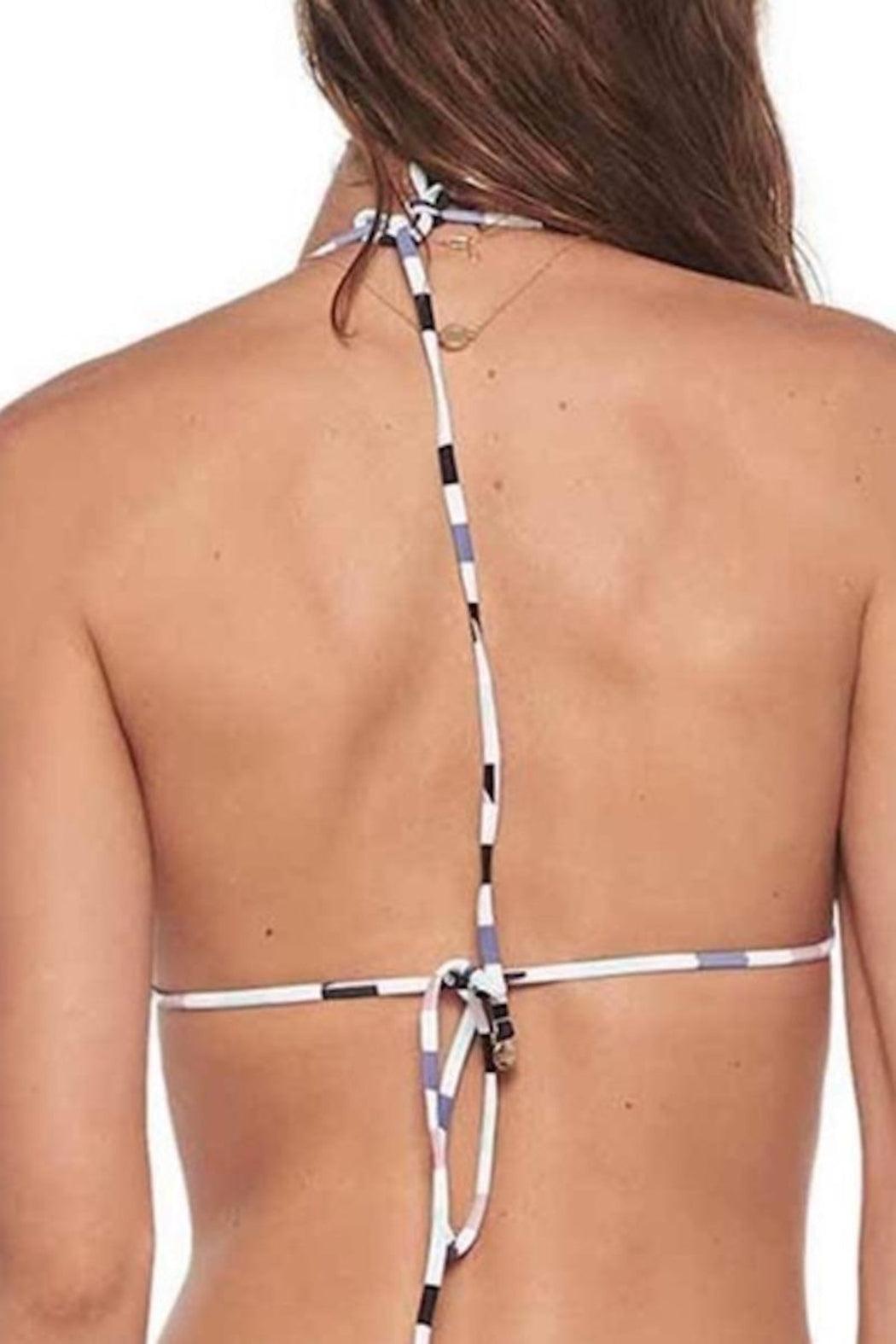 Striped triangle bikini top with removable pads. Striped mid rise bikini bottom. Seamless. Moderate coverage bottoms.