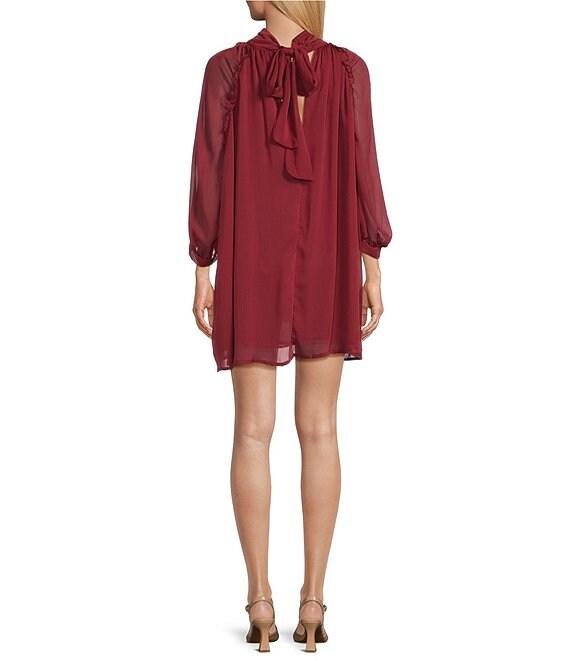 From M made in Italy, this dress features: Georgette fabrication Shift silhouette Mock neckline Self-tie collar at back 3/4 puff sleeves Lined Pull-on construction Approx. 33.5" length Polyester Hand wash cold/flat dry Imported.