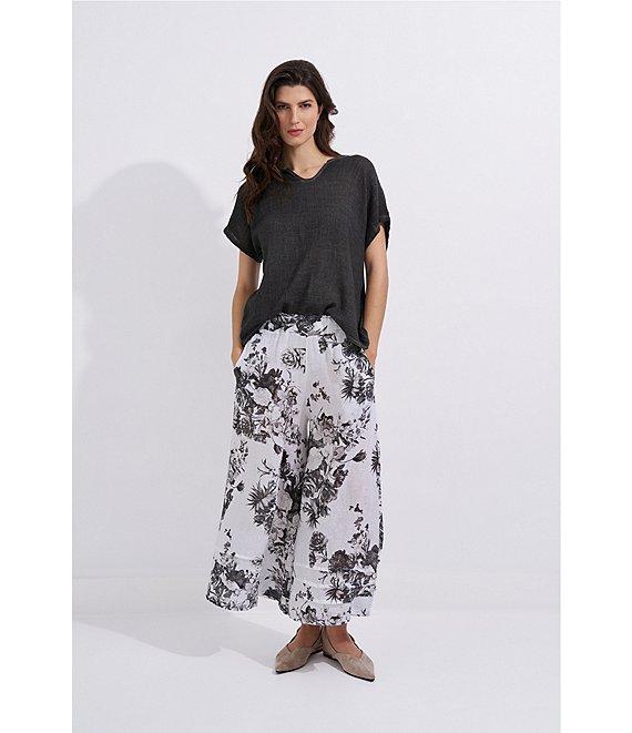 From M Made in Italy, this top features: Woven textured fabrication Split v-neckline Cap batwing sleeves Gauze trim detailing Wider body Straight hemline Pullover construction Approx. 25" length Cotton/linen Machine wash cold/dry flat Imported.