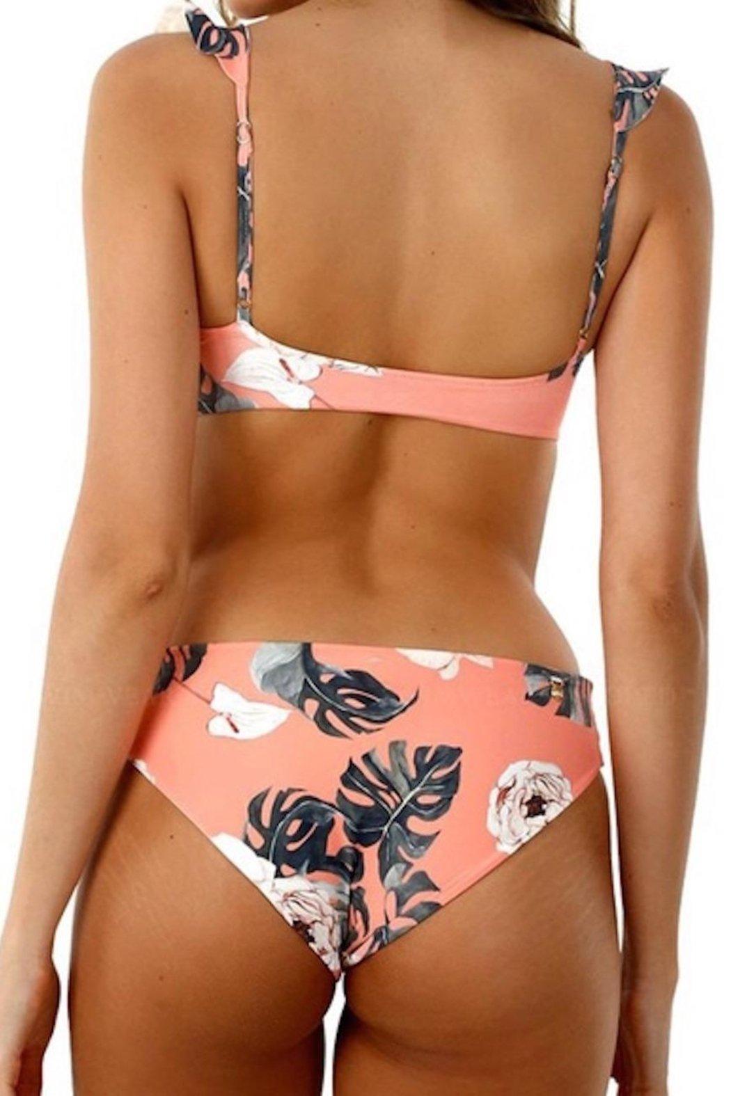 Malai Swimwear Rose Dharma Garden Balearic Top and Dharma Rose Bottom. Floral bralette bikini top with ruffles. Adjustable straps. Removable padding. Fully lined. Low rise bikini bottom. Cheeky coverage. Model stands 5'8" (177cm) and wears a size S.