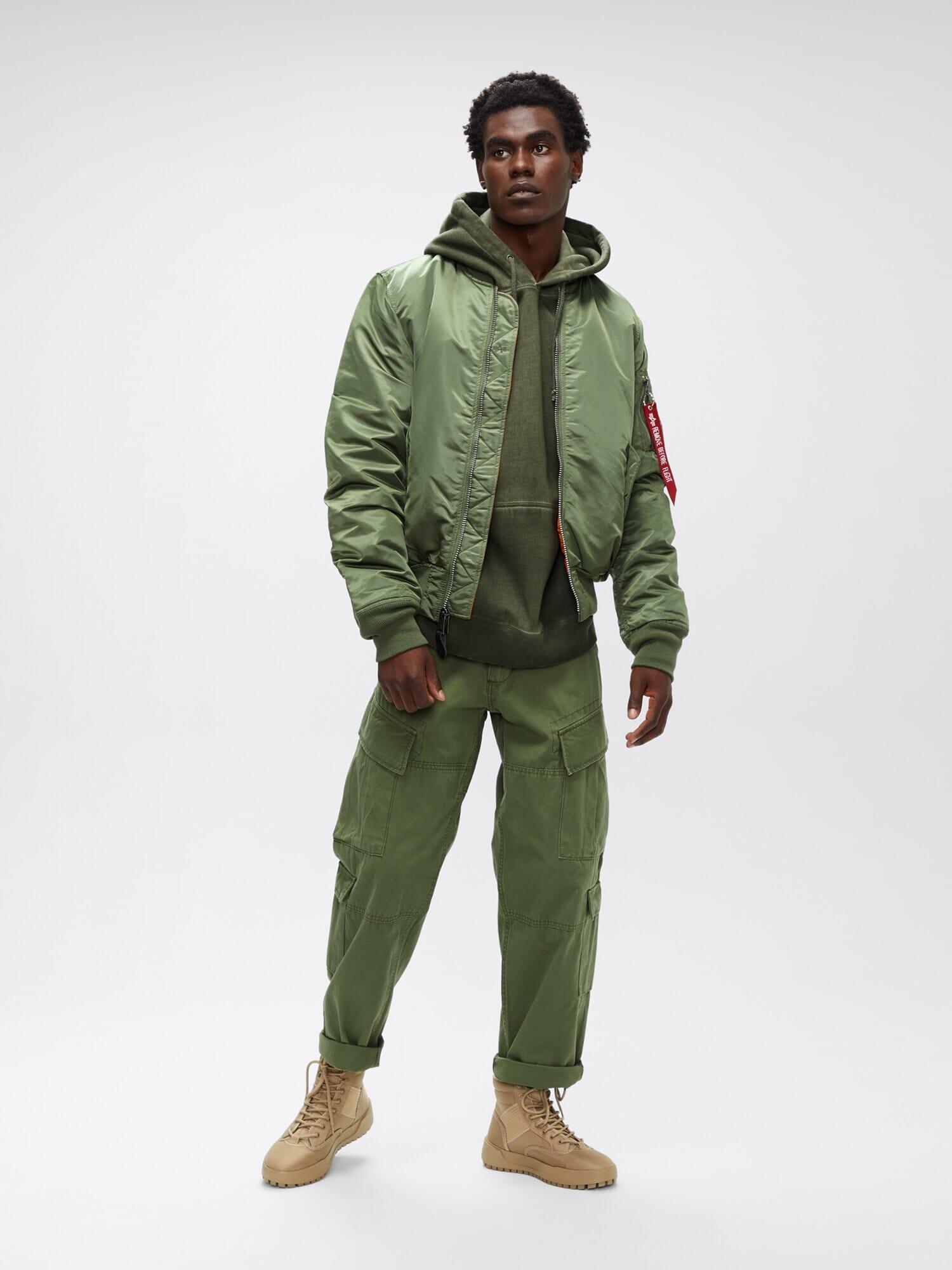 PRODUCT DETAILS Inspired by the original jackets worn by U.S Air Force and Navy pilots in the 1950's, the MA-1 Slim Fit bomber jacket with poly-fill and orange lining is the perfect take on a classic bomber jacket silhouette. The modern cut provides a slim fit. Male Model Information: Height: 6'0' Size: Large DETAILS Alpha's classic flight nylon MA-1 bomber in a contemporary slim silhouette BENEFITS Water Resistant Reversible FEATURES Alpha logo on zig-zag zipper extension MA-1 utility pocket on sleeve Signature red ribbon on utility pocket zipper Sleeve shirring Two lower flap pockets Two interior welt pockets Knit rib collar, cuffs and waistband Ottoman knit cuffs