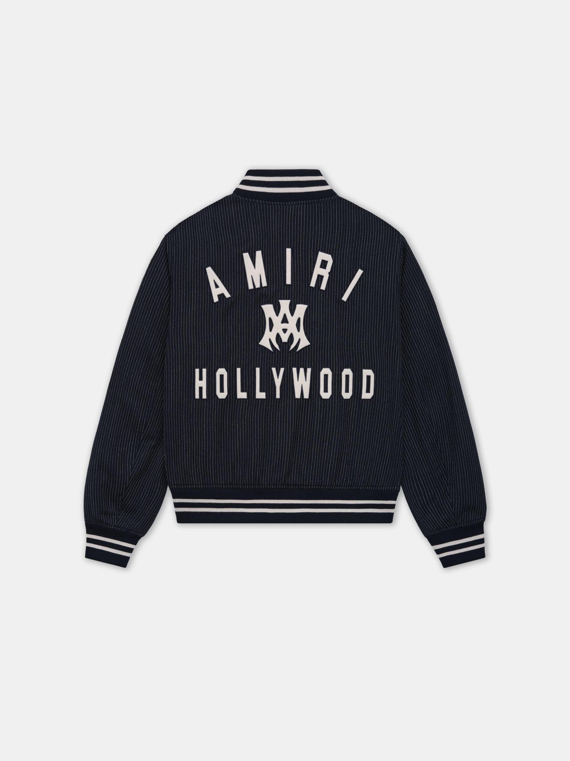 For Pre-Spring 2025, AMIRI Hollywood is introduced as a fictionalized sports team established in the house's hometown of Los Angeles. The MA Hollywood Pinstripe Bomber is crafted from wool and features patch appliqué, welt zipper pockets, snap button closure, and banded rib finishes. PRE-SPRING 2025 COLLECTION MADE IN ITALY 100% VIRGIN WOOL