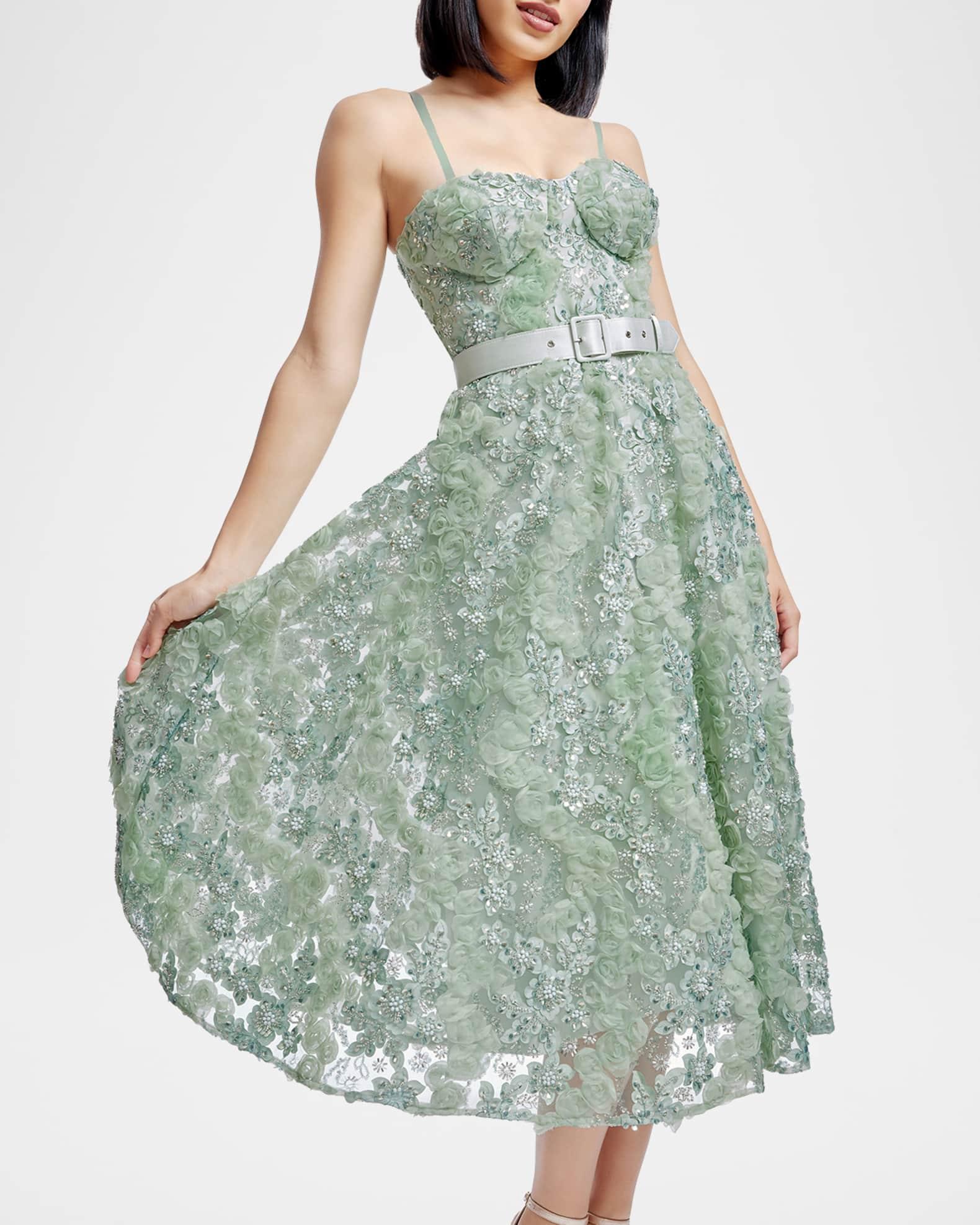 Dress the Population Black Label "Mabel" midi dress with allover sequins, beading, and floral rosette appliqués Approx. 37"L from neckline to hem Sweetheart neckline Sleeveless Adjustable straps Belted waist Hem falls below the knee A-line silhouette Invisible back zipper Polyester Lining: Polyester Hand wash Imported