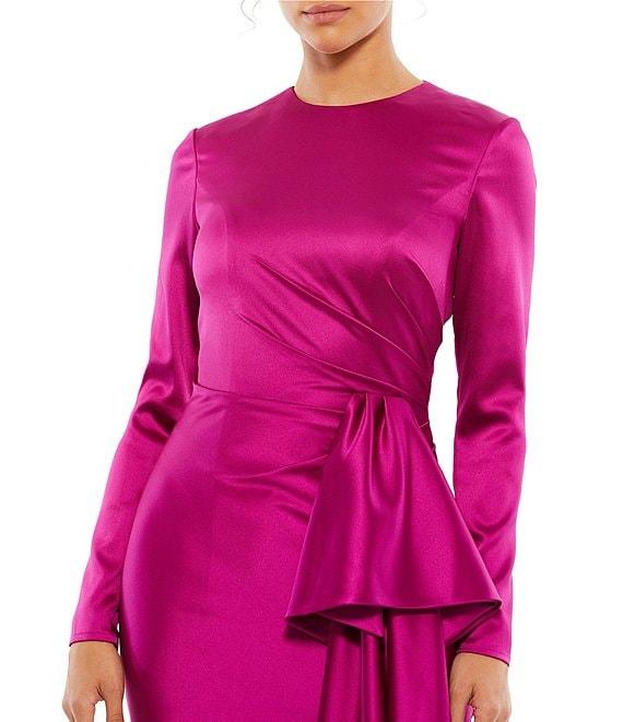 From Mac Duggal, this dress features: Satin fabrication Sheath silhouette Crew neckline Long sleeves Asymmetrical drape Zip back closure Approx. 34" length Polyester Hand wash cold Imported.