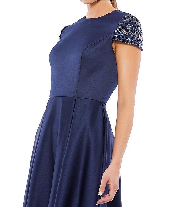 Mac Duggal Beaded Cap Sleeve Crew Neck Satin Midi Dress
