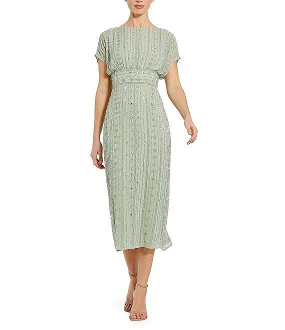 Mac Duggal Beaded Chiffon Short Sleeve Boat Neck Sheath Midi Dress