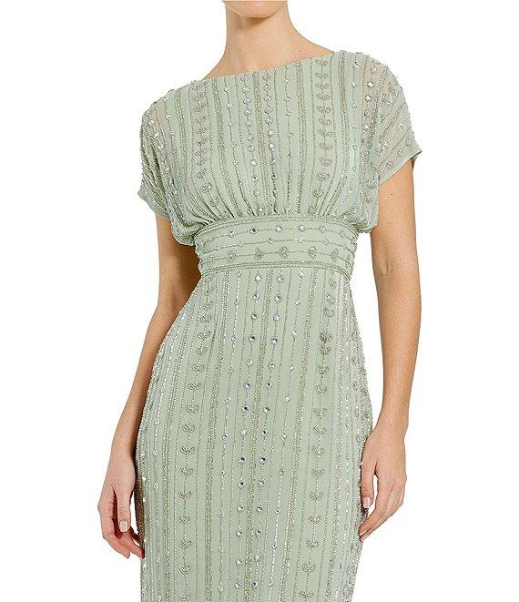 From Mac Duggal, this dress features:Chiffon fabricationSheath silhouetteBoat neckline Short sleevesAll over beaded embellishment Fully lined Center back zip closure Approx. 48.5" length from hipsPolyesterSpot clean Imported.