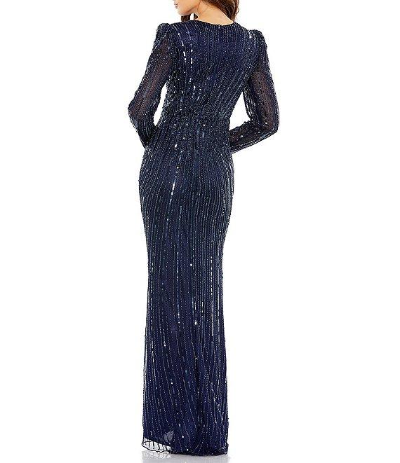 From Mac Duggal, this gown features: all over beaded fabrication Sheath silhouette Crew neckline long puffed sleeves fully lined center zip back closure Approx. 61" in length from shoulder to hem polyester spot clean Imported.