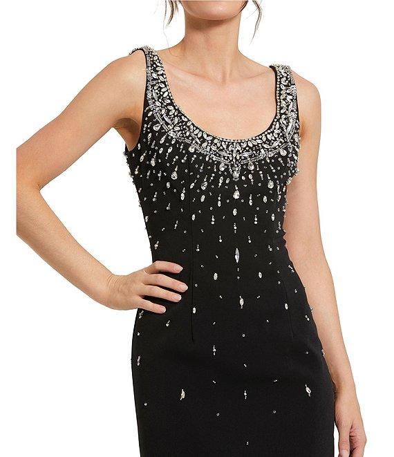 From Mac Duggal, this dress features: Jersey crepe fabrication Sheath silhouette Scoop neckline Sleeveless Beaded embellishment Zip back closure Approx. 48" length Polyester Hand wash cold Imported.