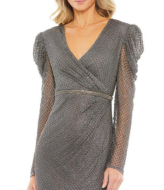 From Mac Duggal, this dress features: all over beaded fabrication Surplice v-neckline long puffed sleeves fully lined center zip back closure approx. 48.5" length from shoulder to hemline polyester spot clean Imported.