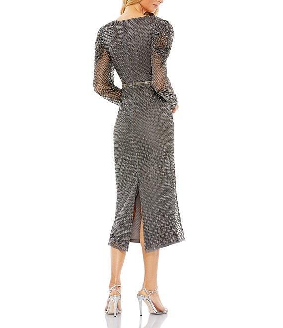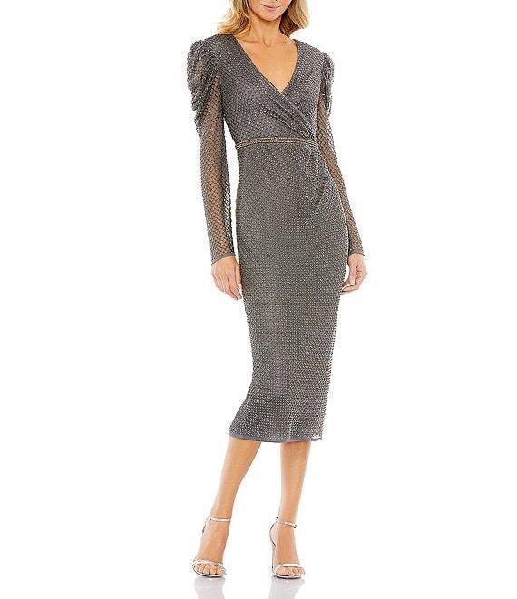 Mac Duggal Beaded Long Puffed Sleeve Surplice V-Neck Midi Dress