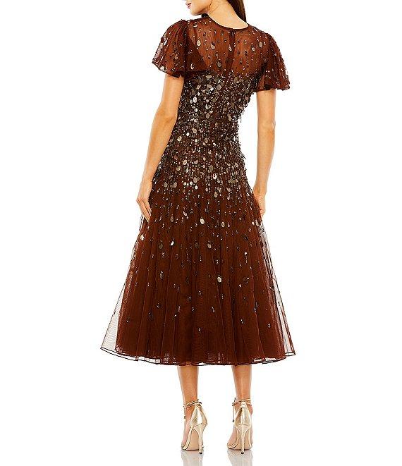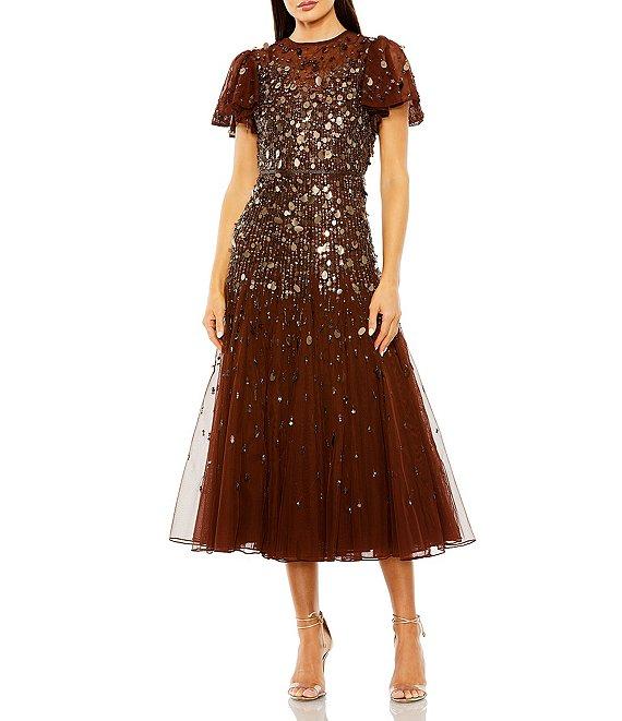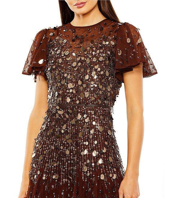 From Mac Duggal, this dress features: Beaded mesh fabrication A-line silhouette High crew neckline Short flutter sleeves Fringe detail Fully lined Straight hemline Concealed center back zip closure Approx. 48" length Polyester Spot clean Imported.