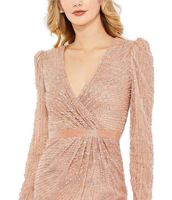 From Mac Duggal, this dress features: all over sequin fabrication surplice v-neckline long sleeves fully lined center zip back closure Approx. 61" in length from shoulder to hem polyester spot clean Imported.