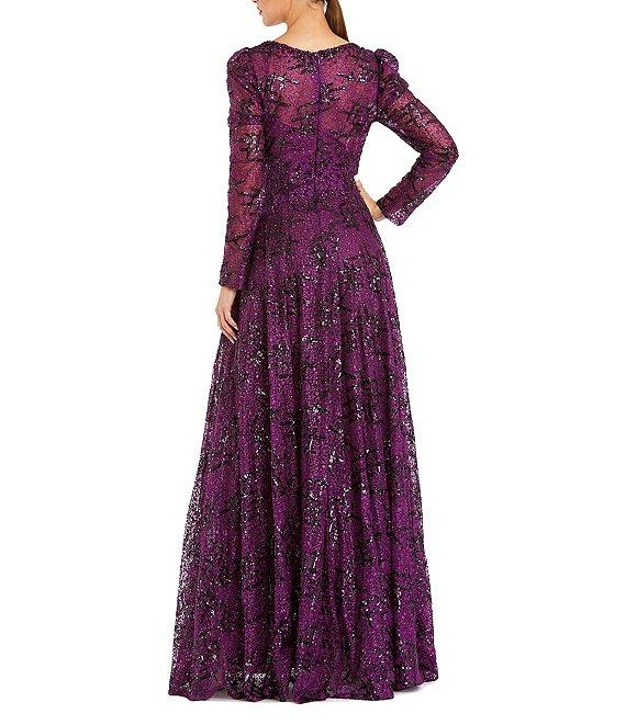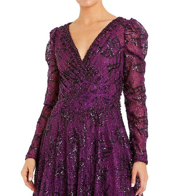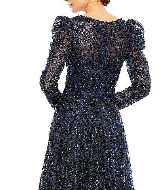 From Mac Duggal, this gown features: all over beaded fabrication v-neckline long puff sleeves fully lined center zip back closure approx. 61" length from shoulder to hemline polyester spot clean Imported.