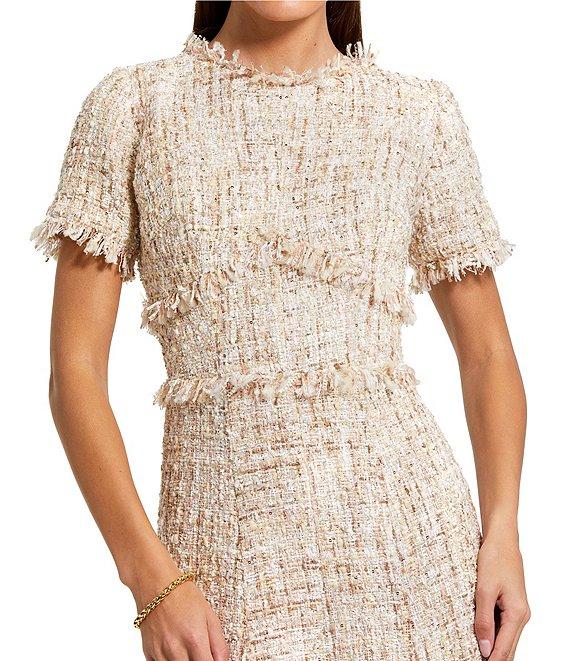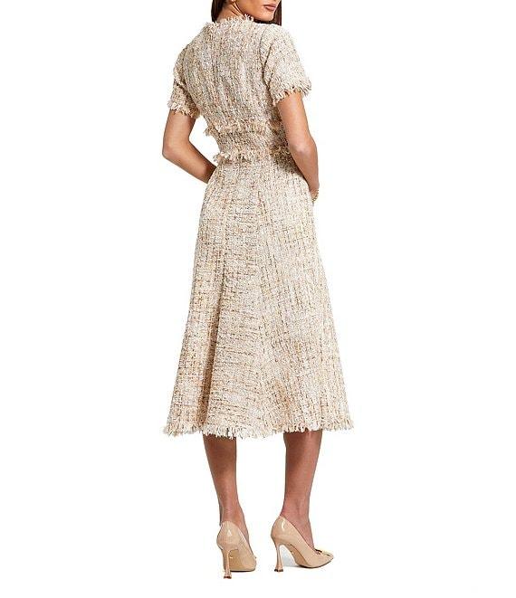 Mac Duggal Boucle Tweed Short Sleeve A-Line Midi Dress