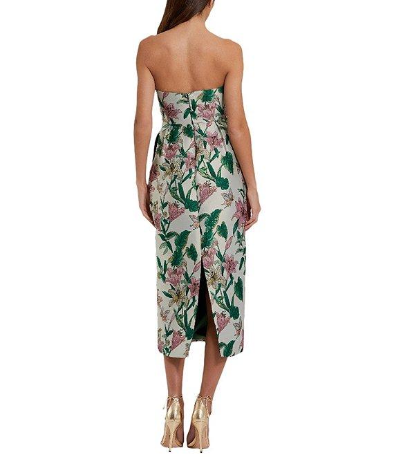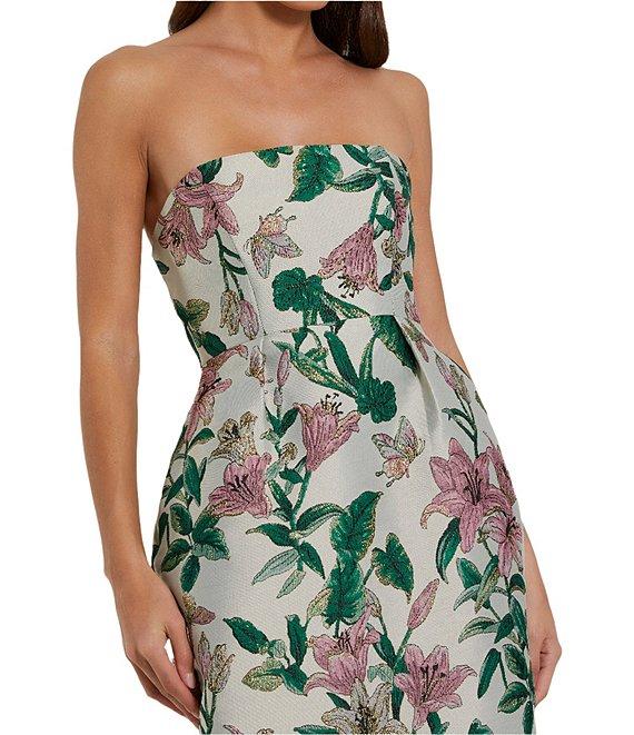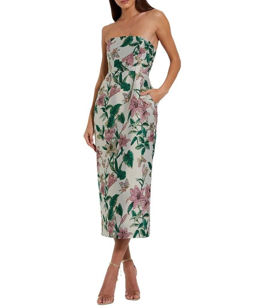 Mac Duggal Brocade Floral Print Strapless Neck Sleeveless Sheath Midi Dress